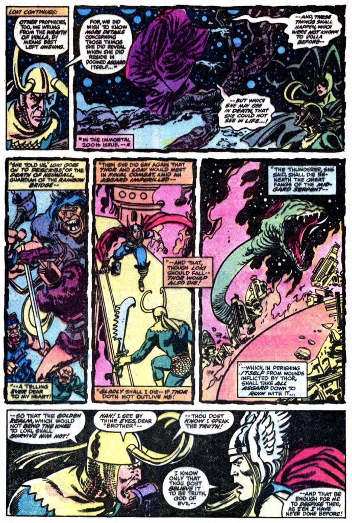 With Thor now bereft of his hammer and Ragnarok another step closer to happening, evil Loki cannot hold his tongue any longer. He taunts his brother and the rest of the Gods, revealing how he and Hela, the goddess of Death, resurrected the prophetess Volla and learned the secrets of what needed to happen in order to bring about the day of doom. Loki has steadily worked towards that purpose ever since. But he may have been wiser to keep his mouth shut, because Odin hereafter sentences him to a punishment straight out of myth: Loki is chained beneath a huge viper, whose venom drips upon him constantly, burning him. Loki’s recently-returned wife Sigyn petitions Odin to be permitted to give her husband some relief from his pain, but the pan she brings for such a purpose is shallow, and she much constantly turn to empty it of venom, allowing more of the stuff to drip onto Loki in the meantime. Those Norseman really knew how to torture a person.