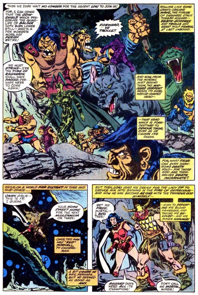 Those characters included Earthly reporter Harris Hobbs, who along with his film crew had scammed a trip to Asgard intending to film it as a Network Special. But one of Hobbs’ men, cameraman “Red’ Norvell, was inveigled by Loki to steal first Thor’s iron gauntlets and belt of strength ,and then to wrest his enchanted hammer away from him. Norvell did this due to his immediate attraction to Lady Sif, who wouldn’t give him the time of day. Having clobbered the true Thunder God, Norvell as the New Thor had taken off, with Sif in tow. And that’s where this issue opens.