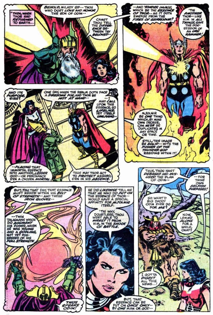 As Norvell wonders about just how he was transformed into another Thor, Sif recounts to him the events of an earlier day, one in which Odin feared that the true Thunder God might one day exhaust his power in defense of Earth, leaving Asgard bereft of it in a time of need. And so he drew from his son a portion of the essence of his being, and implanted it into the belt of strength and the iron gloves, so that should such a day come, another Thor might rise to save everyone. By putting them on, Red Norvell has upset Odin’s design–but the surly cameraman isn’t moved by Sif’s plea.