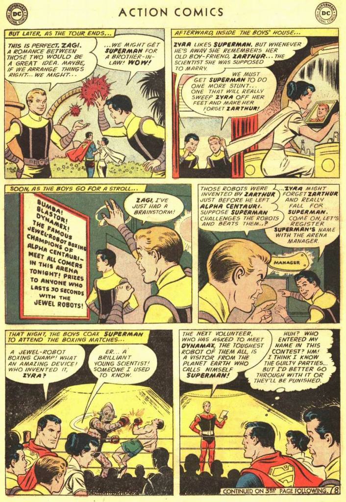 For his part, Superman is aware in broad terms of what is going on, and he’s also come to realize that Zyra is actually pining for her lost boyfriend Zarthur, a scientist who disappeared while searching for a legendary graveyard planet in the Krob sector of space. The Man of Tomorrow wastes no time in locating Zarthur and rescuing him from the menacing Krobs, returning him to Alpha Centauri so that he can pick up his relationship with Zyra and Superman will be off the hook. As for teh escaped crook, Zigi and Zagi sent him back to prison in a teleport capsule earlier, with the intent of keeping Superman around while he searched in vain for him.