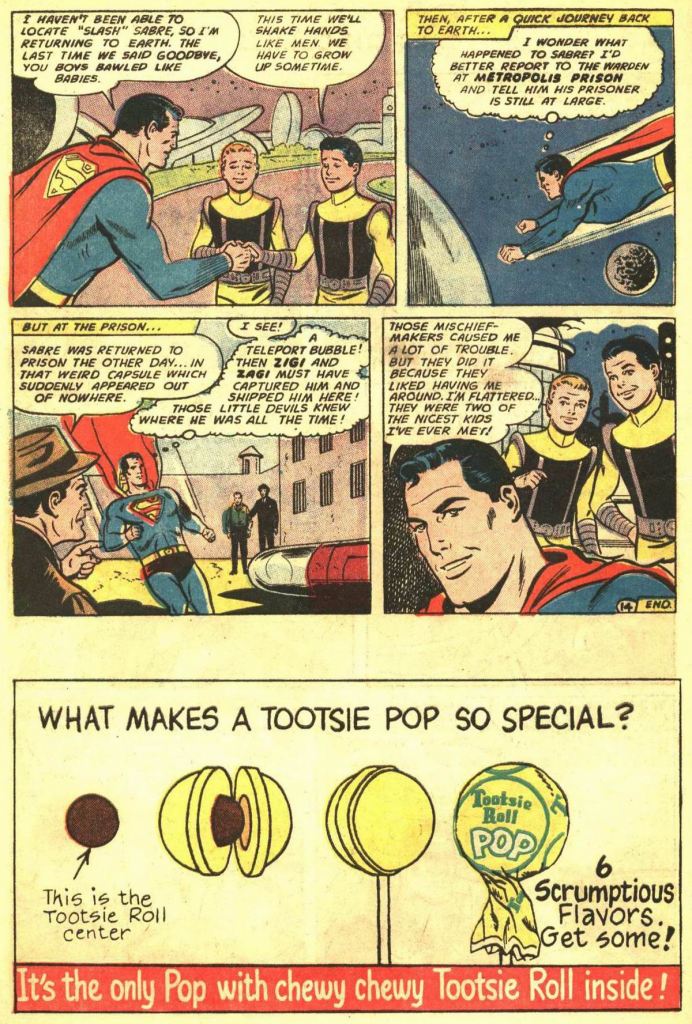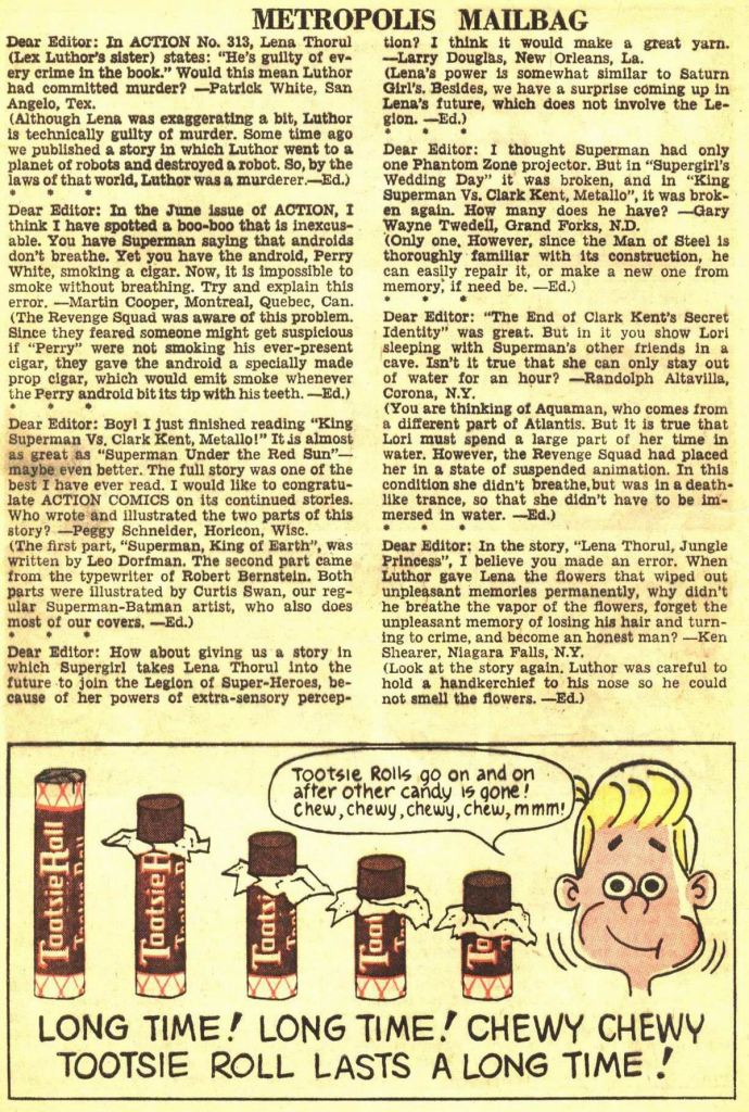 In a break from tradition, before the lead story is even finished we get the issue’s Metropolis Mailbag letters page, in which Mort as the anonymous editor answered his young audience’s questions. This issue also included a short write-up on Supergirl’s boyfriends as a space-filler at the bottom of a 2/3 ad for Trix cereal.