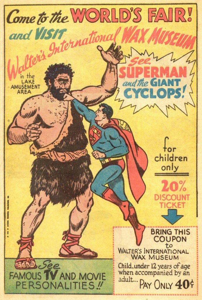 This issue also included a full page advertisement for the World’s Fair, with special emphasis on the wax tableau of Superman battling a giant cyclops. Sadly, the real life exhibit wasn’t as amazing as the ad copy made it out to be.
