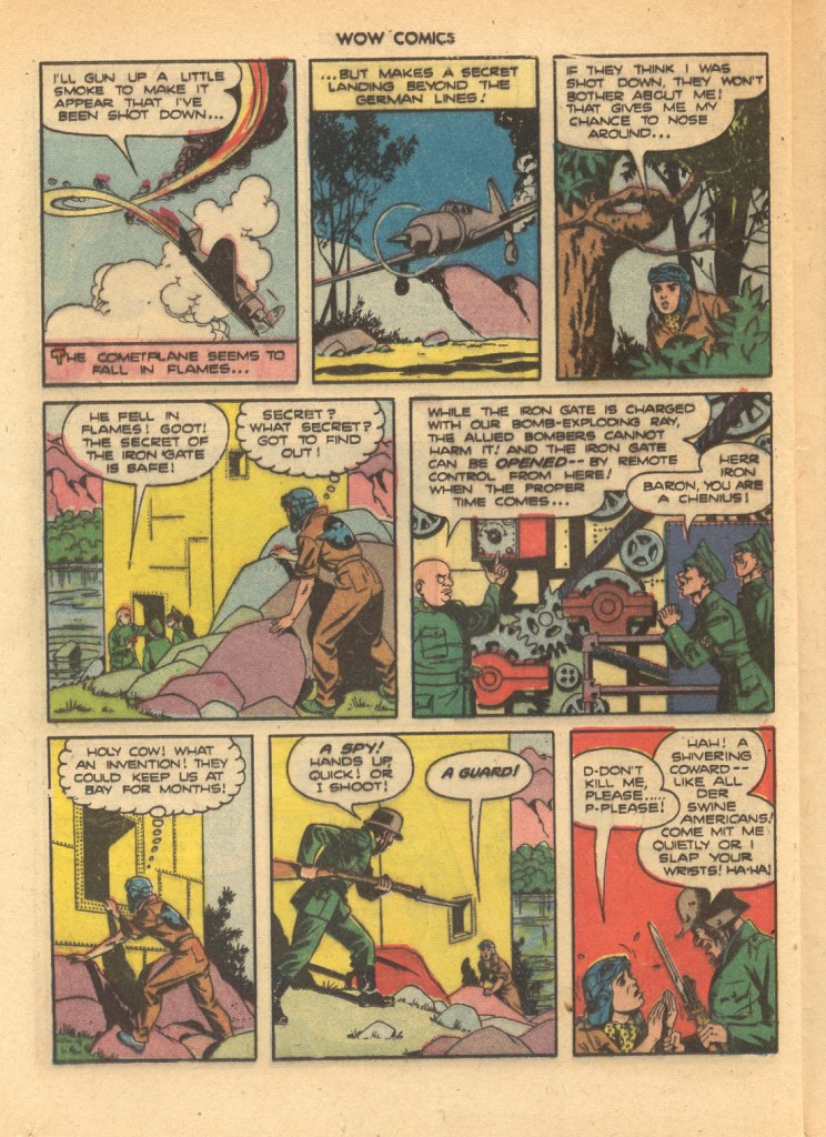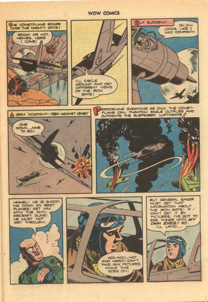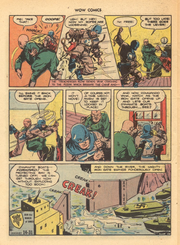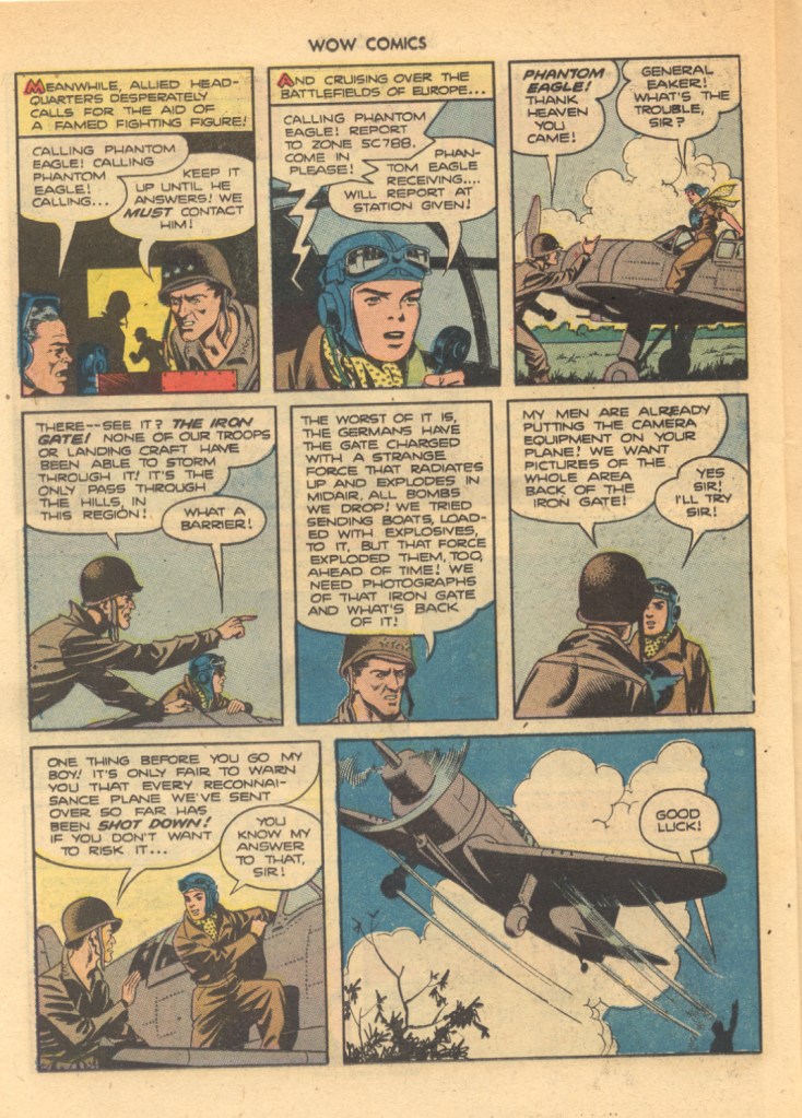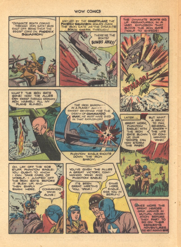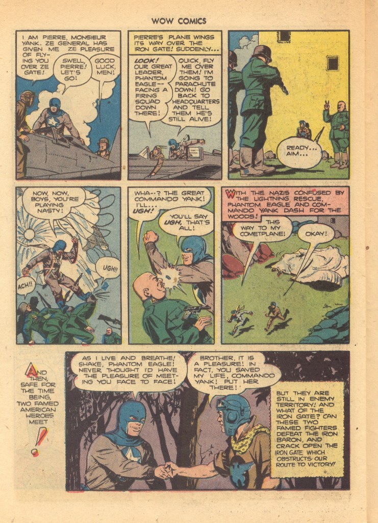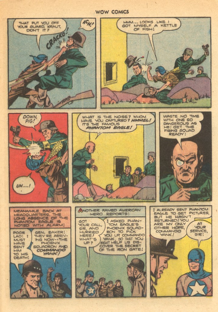 This issue of WOW COMICS includes one such instance, a story that bridges two of the long-running series in the book: THE PHANTOM EAGLE and COMMANDO YANK. Strictly speaking, the Phantom Eagle wasn’t really a super hero, he was one of the many aviator heroes that littered the skies back during the time of the War. But he was a popular second banana in WOW COMICS and thus able to be involved in such a venture. (His strip, drawn by Mark Swayze, was also better drawn than the Yank’s was.)