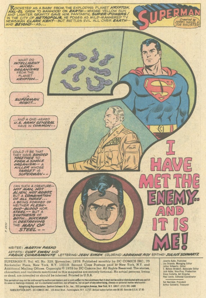 This was the latest story in Marty Pasko’s tenure writing the Man of Steel. I had really been enjoying his stories, at least up to a point, and yet I jumped off after this nonetheless. I have no concrete explanation for why this should be so, but it was. Pasko had introduced some running subplots and a greater emphasis on characterization into the mix in emulation of the Marvel books of the period, and these were elements that I enjoyed. And Curt Swan’s depiction of Superman was nothing if not reliable, often despite the inconsistent inkers who worked over him such as this issue’s Frank Chiaramonte. The whole thing was a very consistent package–you always knew precisely what you were going to get in an issue of SUPERMAN (and in editor Julie Schwartz’s titles as an overall rule–he maintained one of the most consistent editorial offices at the company.)