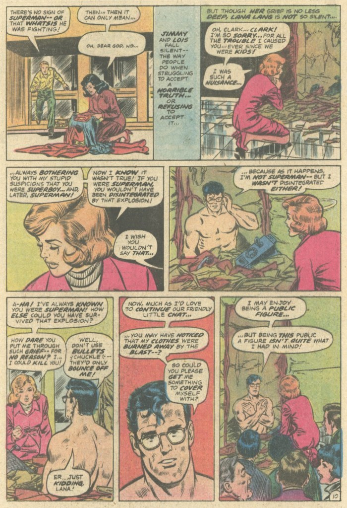 As the battle rages, at the WGBS building, Lana Lang is distraught after Clark Kent was apparently disintegrated in an elevator when the Kryptonoid first attacked. So Superman breaks off his battle because first things first–and to justify the cover, he makes it seem as though an impact with the Kryptonoid has disintegrated him. But really, he’s just doffed his costume so that he can show up in the wreckage of the elevator naked and convince Lana that he’s both not dead and not Superman. Lana, for her part, doesn’t question how every shred of clothing Clark was wearing was disintegrated in the explosion but somehow his glasses survived. With his housekeeping completed, Superman picks up his discarded uniform along the way and heads off after the Kryptonoid once again.
