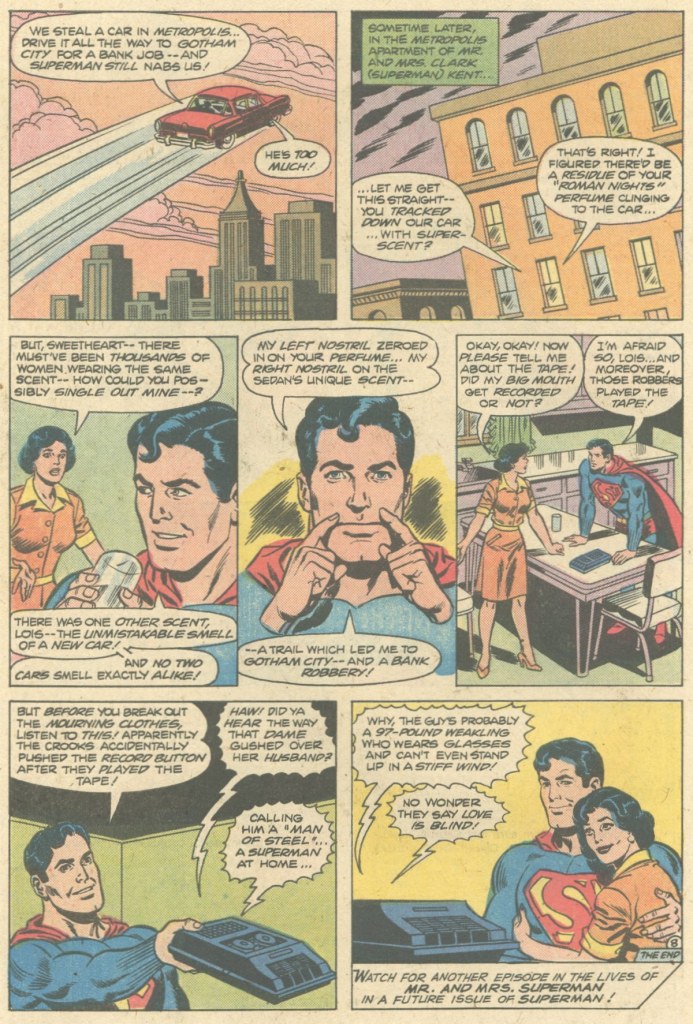 It’s a funny, daffy story in which the newlyweds have purchased their first new car–which is promptly stolen. This wouldn’t be such a big deal, except that Lois left her tape recorder inside it, and she and Clark had been talking openly about him being Superman on the drive home. So now the Man of Steel needs to recover the vehicle before the crooks can listen to the tape and learn his secret identity. He’s mostly successful in this venture, but he isn’t able to get there in time for the tape not to have been played. But it turns out that the criminals just think that this is a new wife fussing over her husband, and don’t give any credence to the notion that the guy whose car they lifted is genuinely Superman.