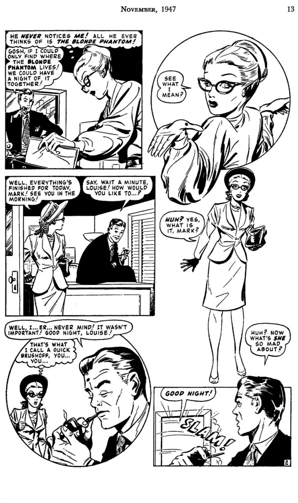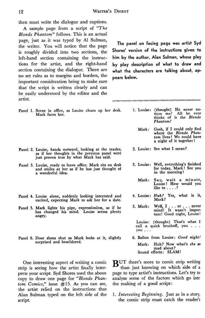As part of the piece,. Stan shares a page of the script to this Blonde Phantom story from issue #15 written by Al Sulman as well as the finished page illustrated by Syd Shores.