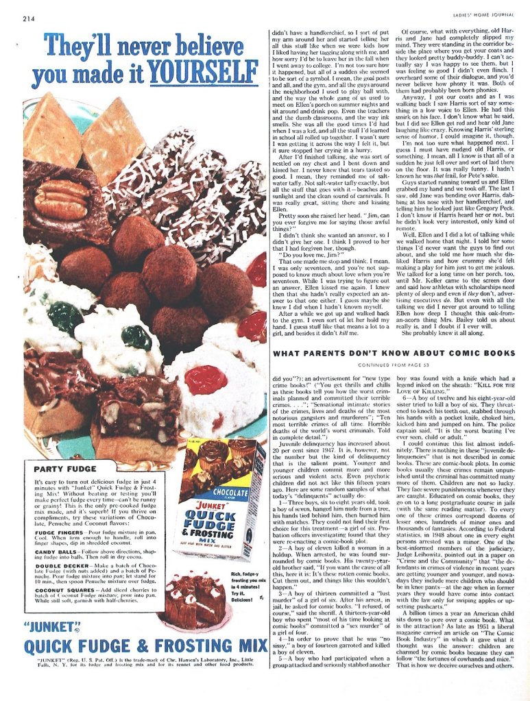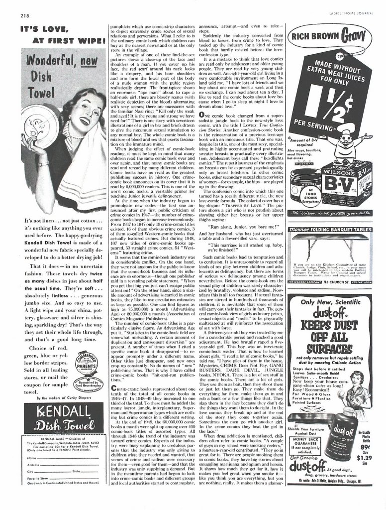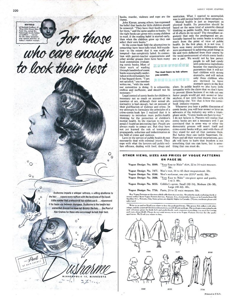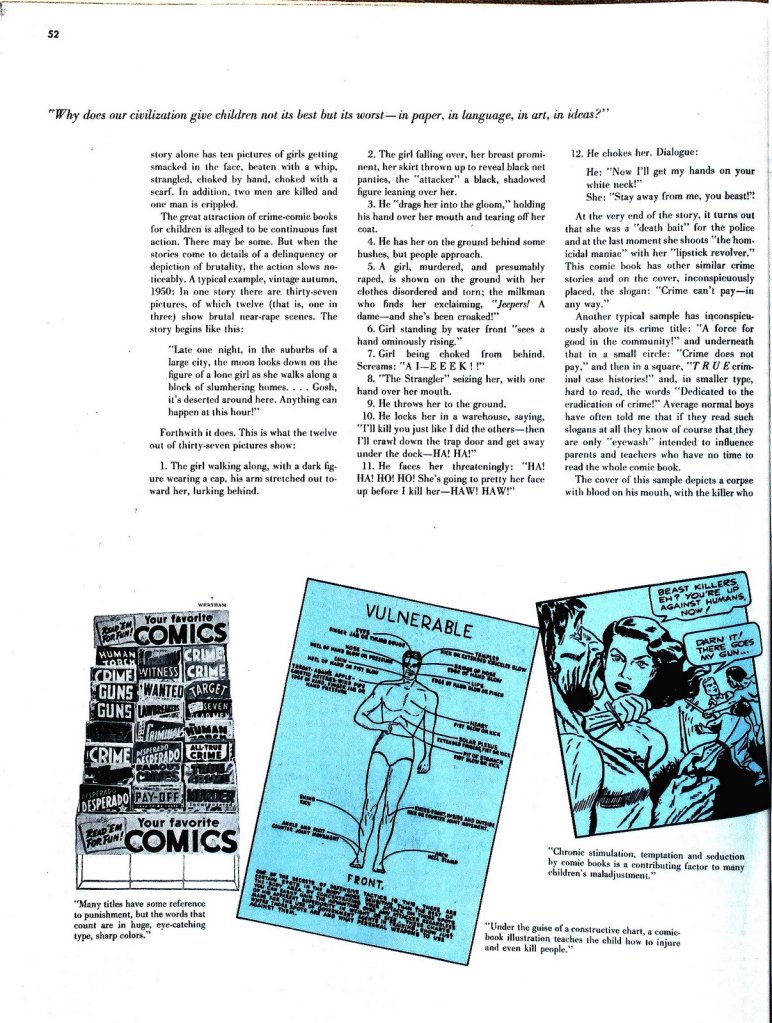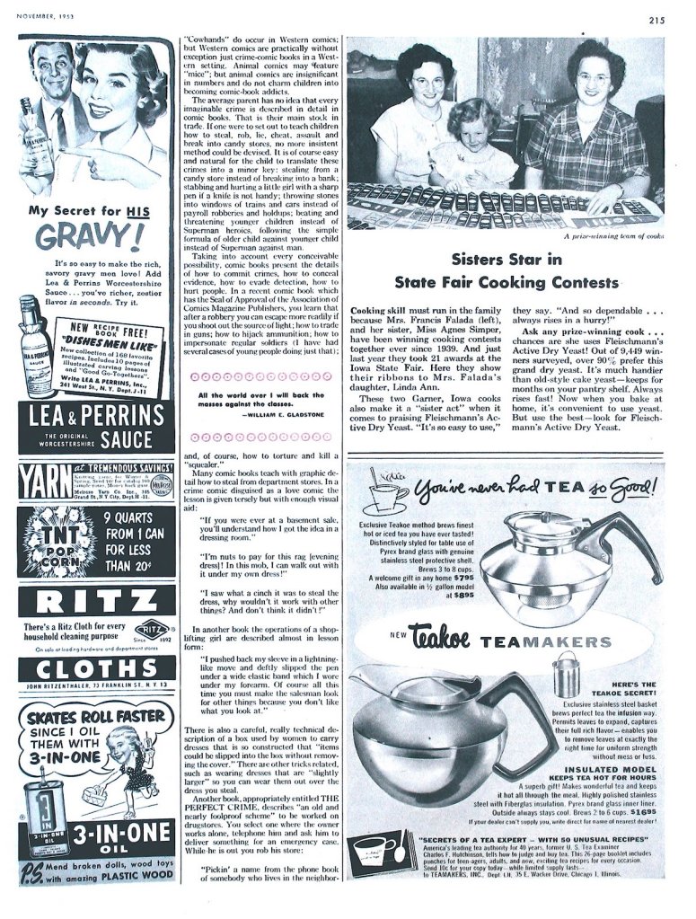 This piece by Wertham from the November 1953 issue of the LADIES’ HOME JOURNAL is a good example of the sort of material that Wertham peddled and how he peddled it. His articles were invariably lurid, and thus able to capture the attention of the reading public. They were also alarmist, and his cherry-picking (and even slanting) of images made it appear that his point was easily proven.