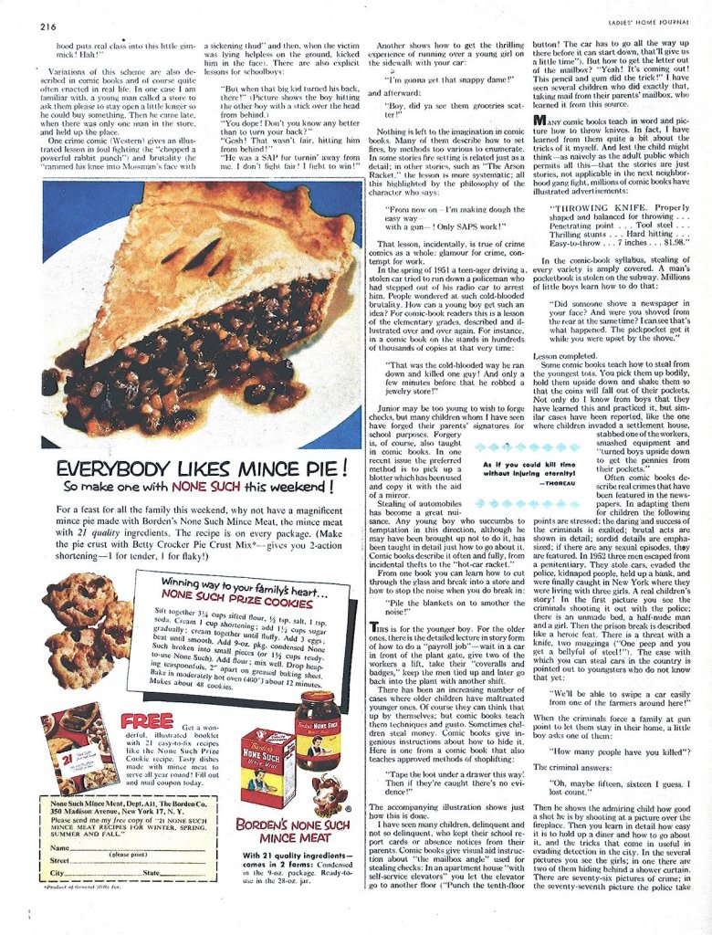 The examples of oppressive influence are there, too. “For those who care enough to look their best.” Jeez. Arm twister or guilt inducer. “My secret for HIS gravy.” Where’s Wertham’s inuendo accusation for these “wholesome” ads? 😉 The lady holding the “wonderful new dish towel”. OK, Mrs. Cleaver. There is at least one blatant lie in this: Not “EVERYBODY LIKES MINCE PIE!” “NONE SUCH”! From Bordens! (I’ve heard of them.)