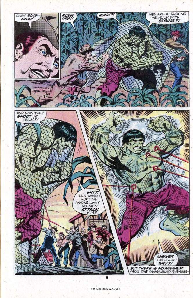 And if truth is told, some of the plotting on this story feels like the sort of thing that would have fit in over in Schwartz’s office. The story opens with the Hulk, continuing his wanderings, having come to ground in a corn field in the American heartland and settled down for a snack. He quickly puts away a frightening amount of corn right off of the husk, and winds up the local farmers when they realize that he’s there. Not being the brightest bulbs, rather than calling in the military to help them, the local sheriff decides to take down the Hulk himself with the help of his deputy and the farmers. This goes about as well as you might expect it would, with the Hulk effortlessly tearing through their capture net and scattering their tractors to the winds.