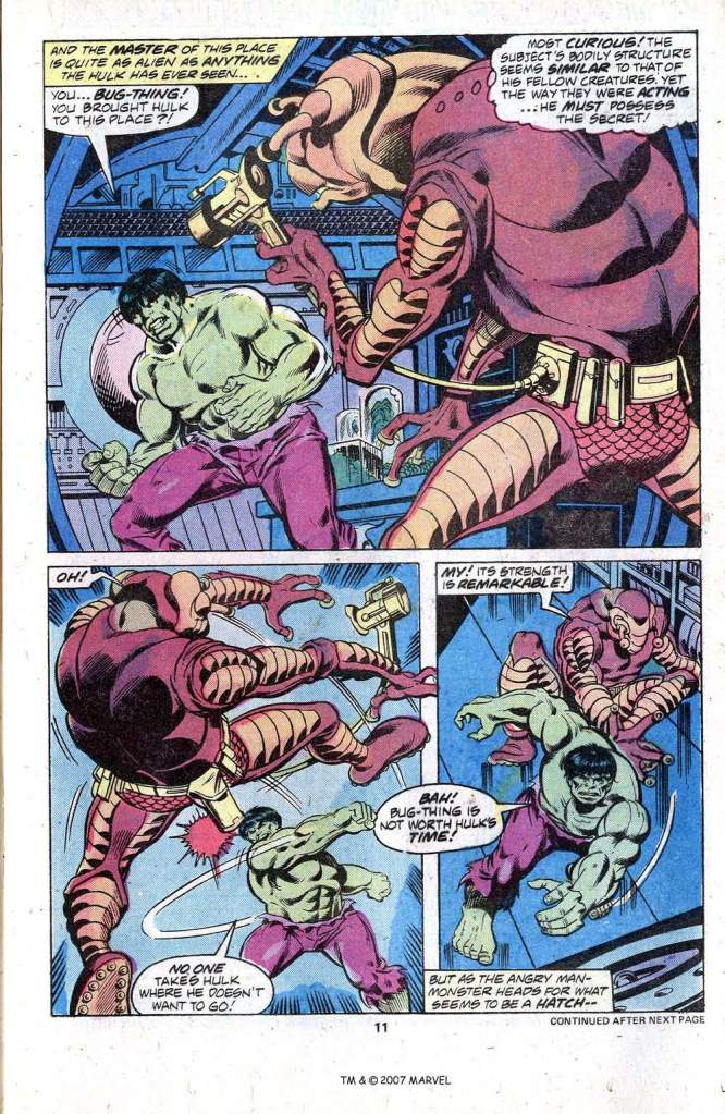 As the Hulk concludes his bout with the locals, he’s suddenly beamed aloft by a spaceship that happens to be passing by–a relatively absurd coincidence on the face of it. There, he’s accosted by a buglike alien who believes that the Hulk may possess the secret that he’s been searching the stars for. The Hulk is too physically powerful to overcome by brute force alone, the alien’s technology and ability to alter the composition of its own form is eventually able to sedate the brute. The alien is surprised, however, when the quieted Hulk begins to shrink back into his puny alter ego of scientist Bruce Banner. This gives a break-point for a single page interlude to keep subplots spinning back at Gamma-Base and cement this otherwise stand-alone story into the ongoing run.
