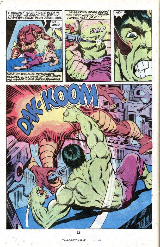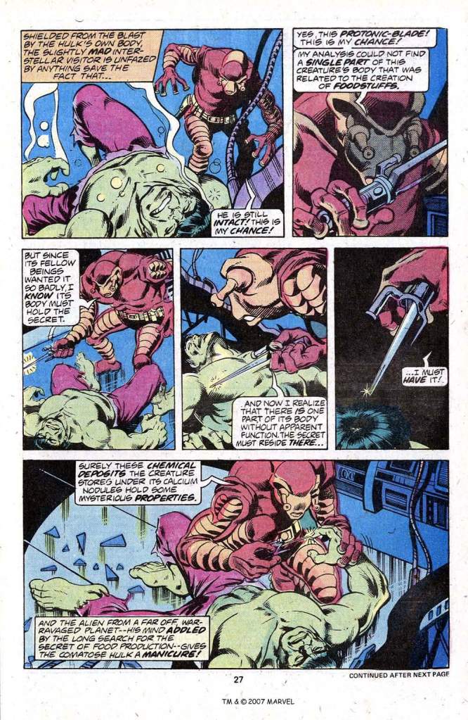 The Bug-Alien at this point, not understanding the change between the Hulk and Banner, feels that it has no alternative but to dissect his captive in order to attempt to locate the element it’s looking for. This terrifies Banner, who swiftly returns to his gamma-empowered form and begins to fight for his life. After a brief scuffle, the Hulk is once again knocked insensate–and the alien uses this opportunity to gather samples of the Hulk’s fingernails. The Alien is looking for the secrets of food production, and figures that the key may lie within the Hulk’s physiognomy for some reason.