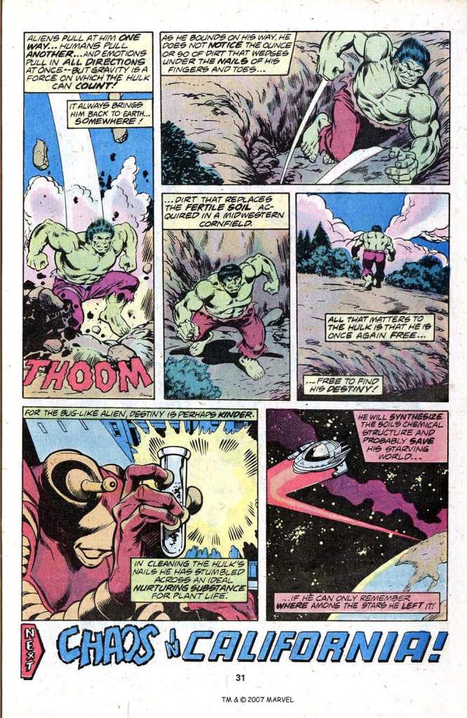 Anyway, the Hulk awakens just as soon as this process is completed and decides that he’s had enough. He smashes his way through the outer wall of the spacecraft and plummets back to the Earth below, landing unscathed by his experience. This is fine as far as the Alien is concerned, as he’s acquired what he needed: soil samples from beneath the Hulk’s nails that are fertile. By synthesizing this soil, the alien will be able to grow edible plant life and save his world with a new source of foodstuff. That is, as the last caption tells us, if he can locate his homeworld again, so long and so far has he traveled. The end.