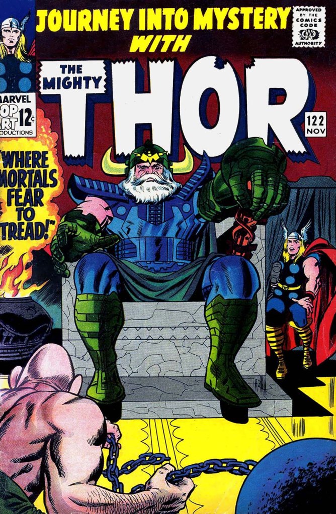 Here’s a very nice cover to JOURNEY INTO MYSTERY that features Wally Wood inking Jack Kirby’s cover pencils. Kirby and Wood didn’t really get to work together much during the Marvel Age–Wood was way too valuable as a penciler in his own right, given that he was capable of plotting as well, a skill set that editor Stan Lee relied on. But Wood was a huge admirer of Kirby’s, and so he took any chance he could get to ink Jack’s work. It’s an interesting cover approach. the big sales point seems to be Odin looking powerful and stern. Thor is stuck off to the side, sneaking in stealthily. And the issue’s villain, the Absorbing Man, has his back to the camera and is crammed into the lower left. Kirby or someone must have reckoned that the cosmic figure of the All-Father would be enough to get prospective buyers to fork over their dime-and-two-pennies.