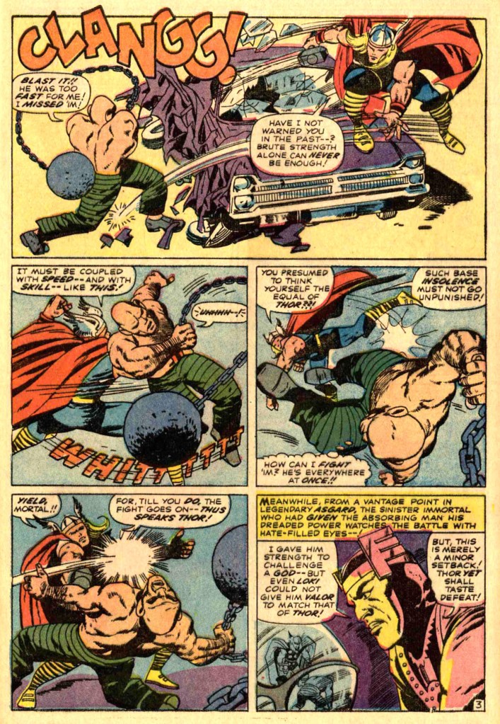 The opening of this story is just a balls-out battle between the Thunder God and his returning foe the Absorbing Man, an enemy whose body takes on the properties and power of any item that he touches. Having liberated himself from captivity under the watchful eye of Ularic the Warlock, evil Loki has dispatched the Absorbing Man to Earth in a bid to wipe out his hated brother. From afar, the God of Evil watches the contest closely, and when it appears as though Thor is about to triumph, Loki teleports his cat’s paw away to far-off Asgard, where he plots his next move.