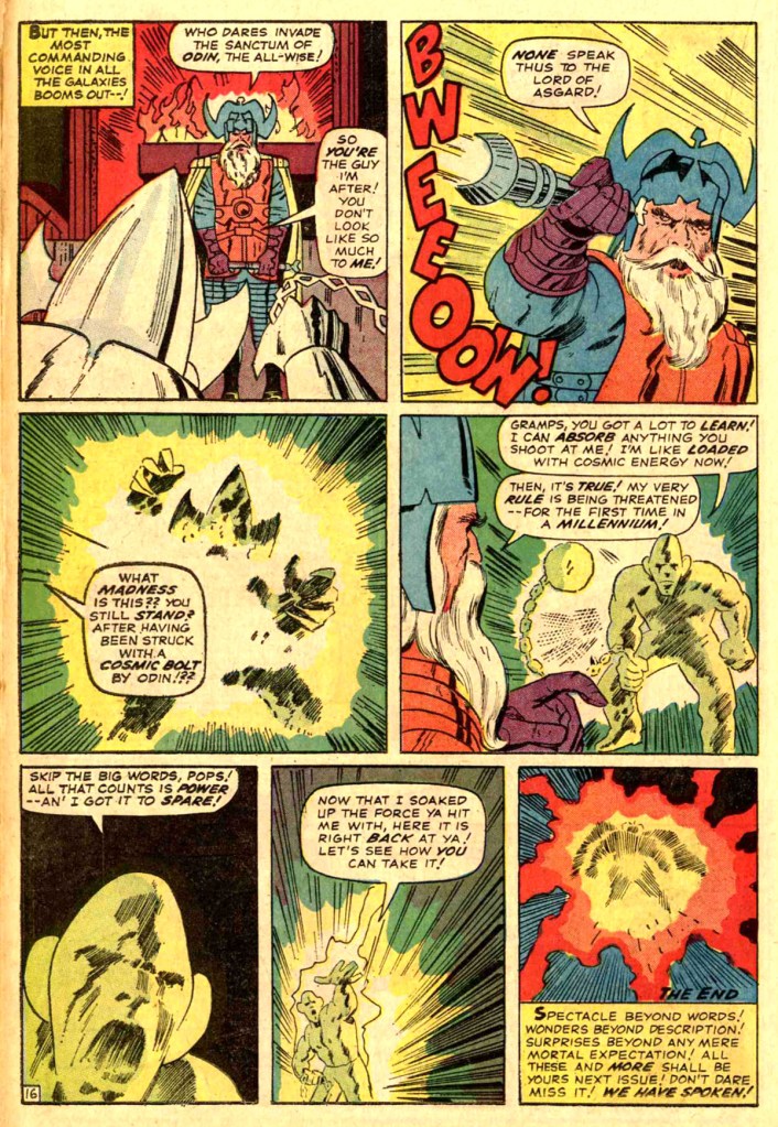 Hobbs is thus cower. But he still manages to sweet-talk Thor into taking him to see Asgard with his own eyes, even if he’ll be made to forget about it afterwards. for no good reason apart from the fact that the plot demands it, Thor agrees. Meanwhile, in Asgard, realizing that Odin’s defenses have been spread thin, Loki decides to sieze the throne directly in a frontal assault. And so he sends the Absorbing Man to attack the All-Father in his throne room. Crusher Creel scatters the remaining Asgardian Gods like tenpins before approaching the person of Odin himself. The All-Father attempts to zap the arrogant mortal, but of course his Odin-Power is simply absorbed by Creel, who sends it back at the aged warrior. And so the battle is joined–as this issue is To Be Continued!