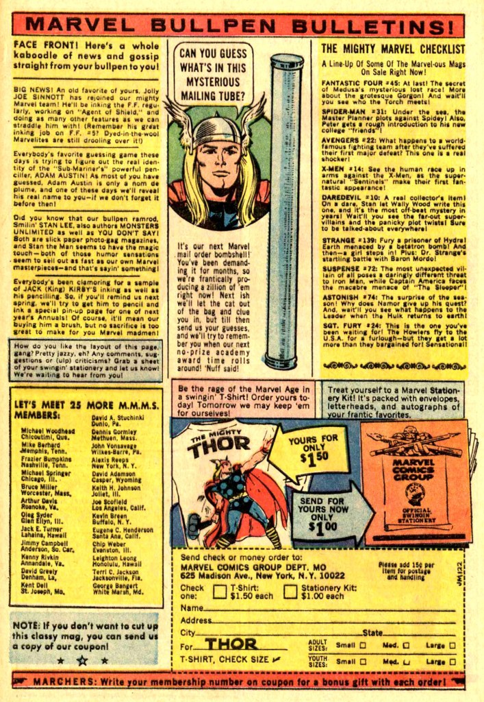 Also new for 1965, the Marvel Bullpen Bulletins page became a central clearing house for the Marvel checklist, the listing of M.M.M.S. members, plugging available tie-in merchandise and just clowning around with the readership and making the names in the credit boxes seem more like real people that you knew. Most of this stuff was exaggerated in Lee’s signature carnival barker style, but that just made it all that much more effective.