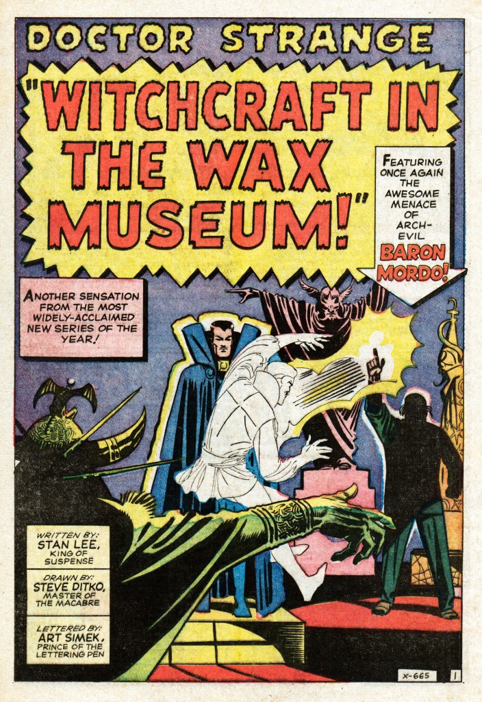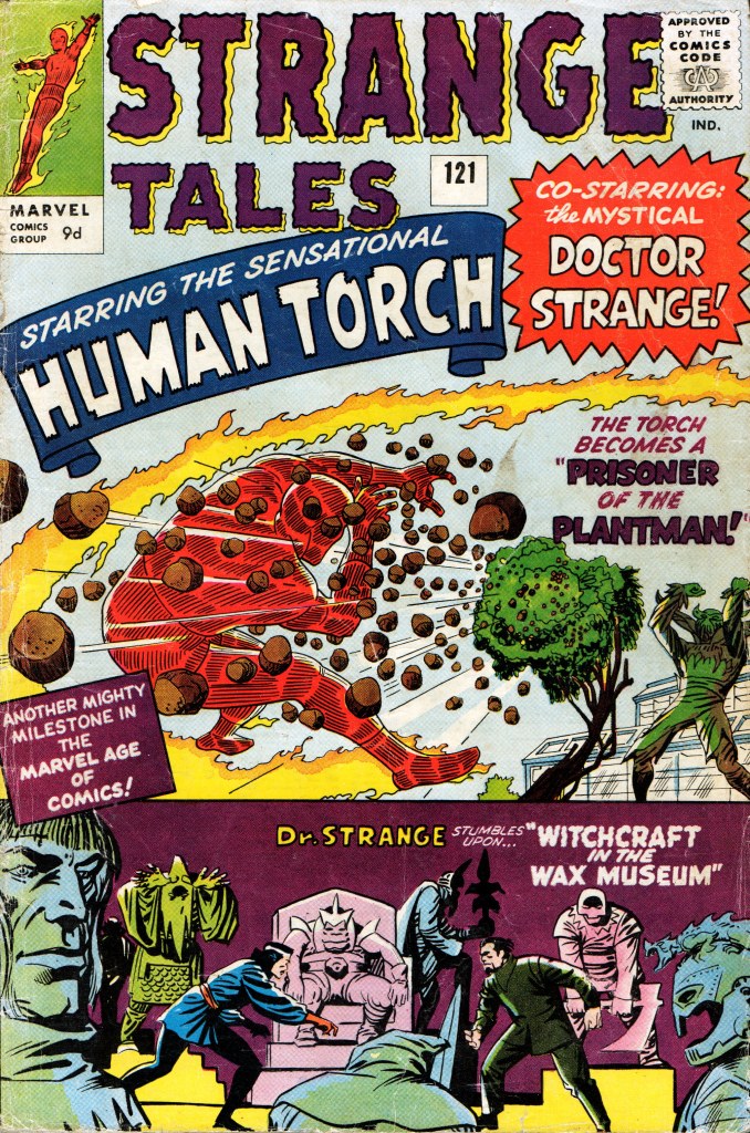 It must have been becoming clear to editor Stan Lee that the quirky back-up strip that he’d let artist Steve Ditko introduce was growing in popularity among the readership. So while it would still be several months before Doctor Strange would headline a STRANGE TALES cover all on his own, he had gone from carrying a burst blurb to a small vignette to occupying a third of the image area, squeezing the Human Torch lead feature into smaller and more awkward spaces. And it’s no wonder, really–while the Torch was more popular than Doctor Strange overall, this was due to his involvement in FANTASTIC FOUR. His series here in STRANGE TALES was decidedly weak sauce much of the time.