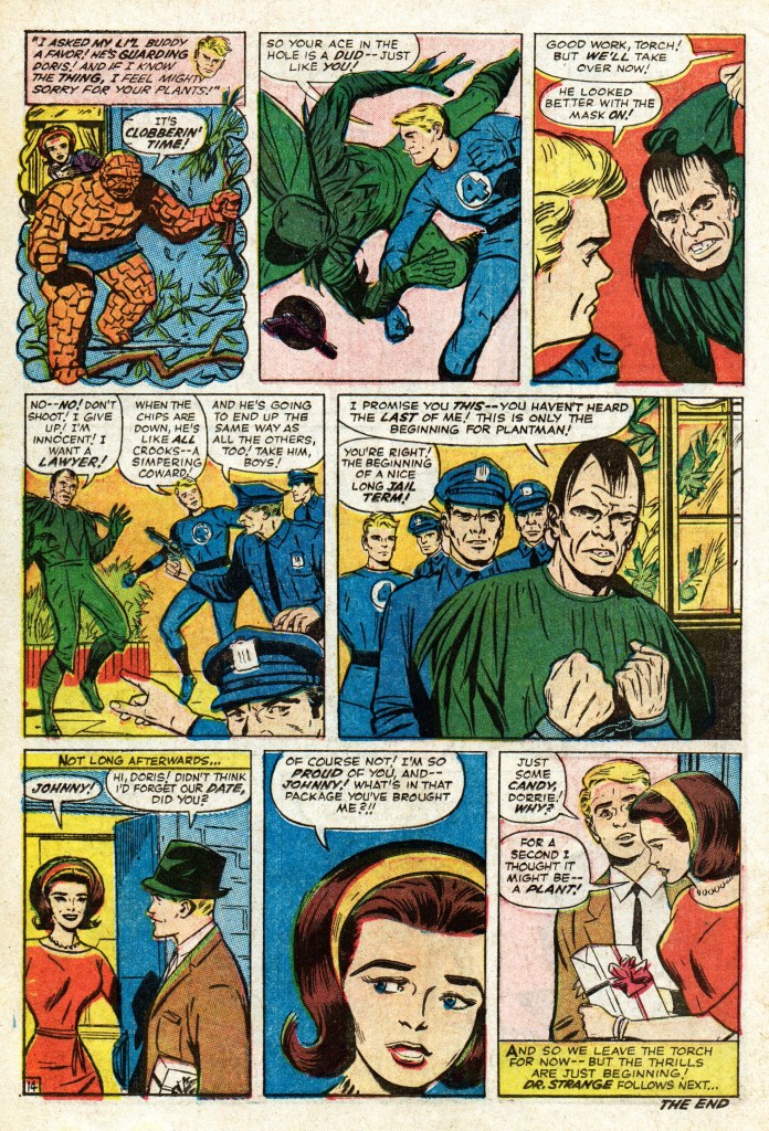 In the end, the Torch wins by, well, winning pretty much. He doesn’t really do anything clever or interesting, he just comes out on top because he’s the good guy. Right before teh end, Plantman tries to get Johnny to relent, telling him that a deadly plant has been left with his girlfriend Dorrie Evans that will kill her should the Plantman not call it off. But knowing that the Plantman had a grudge against Dorrie’s father, the Torch asked the Thing to stay with her, and he effortlessly eliminated the homicidal plant. And that’s a wrap on this one! It’s a good thing that Doctor Strange was catching on, because I can’t imagine many readers coming back month after month for work of this nature. This is simply not good at all.