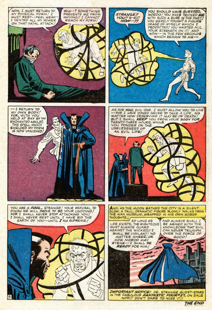 Strange is able to follow the trail of his human form to a nearby wax museum, where it has been set up to look like an exhibit. But it’s surrounded by a spell that prevents Strange from re-entering it–and if he’s separated from his human form for 24 hours, he will die. The perpetrator is of course Baron Mordo, but Strange is able to trick him into entering his ectoplasmic state as well, then venting all of his power on an illusion that Strange has created. (Lee accidentally has Mordo refer to Strange as Doctor Doom once during this fight.) With Mordo exhausted, Strange is able to easily restrain him, then break the spell shielding his body and retake it before the time limit is up.