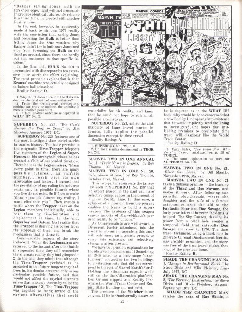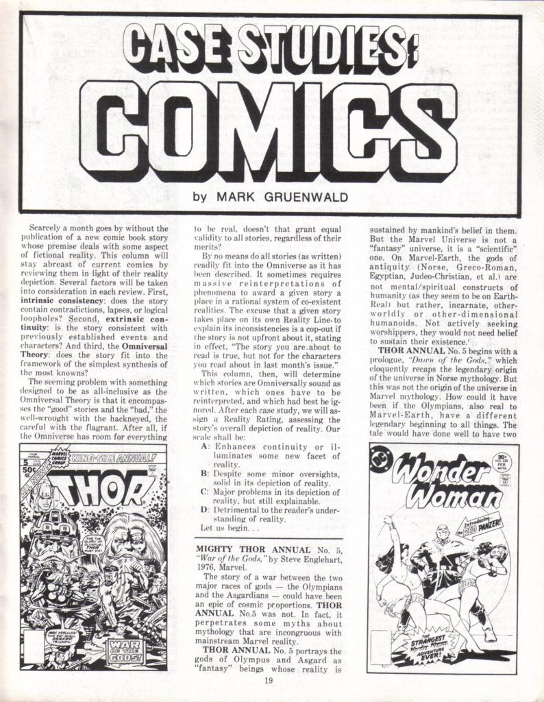 After a write-up of several recent science fiction stories, Gruenwald takes it upon himself to review several recently-released comic books to see if they measure up to his own beliefs and standards about the manner in which fictional reality should be consistently portrayed. This is kinda a suspect metric to be applying, in that none of the creators involved were in any way aware of Mark’s Treatise, nor were they expected to abide by its rules. But it let Gruenwald dissect and discuss a bunch of recent stories, so there’s that.