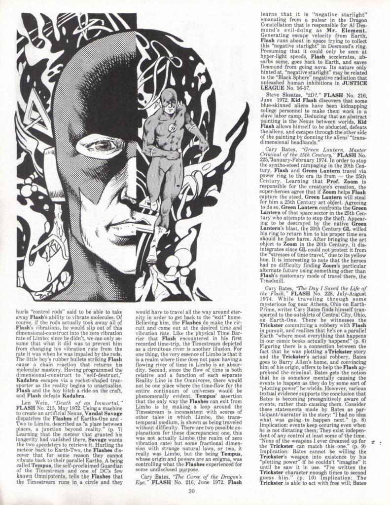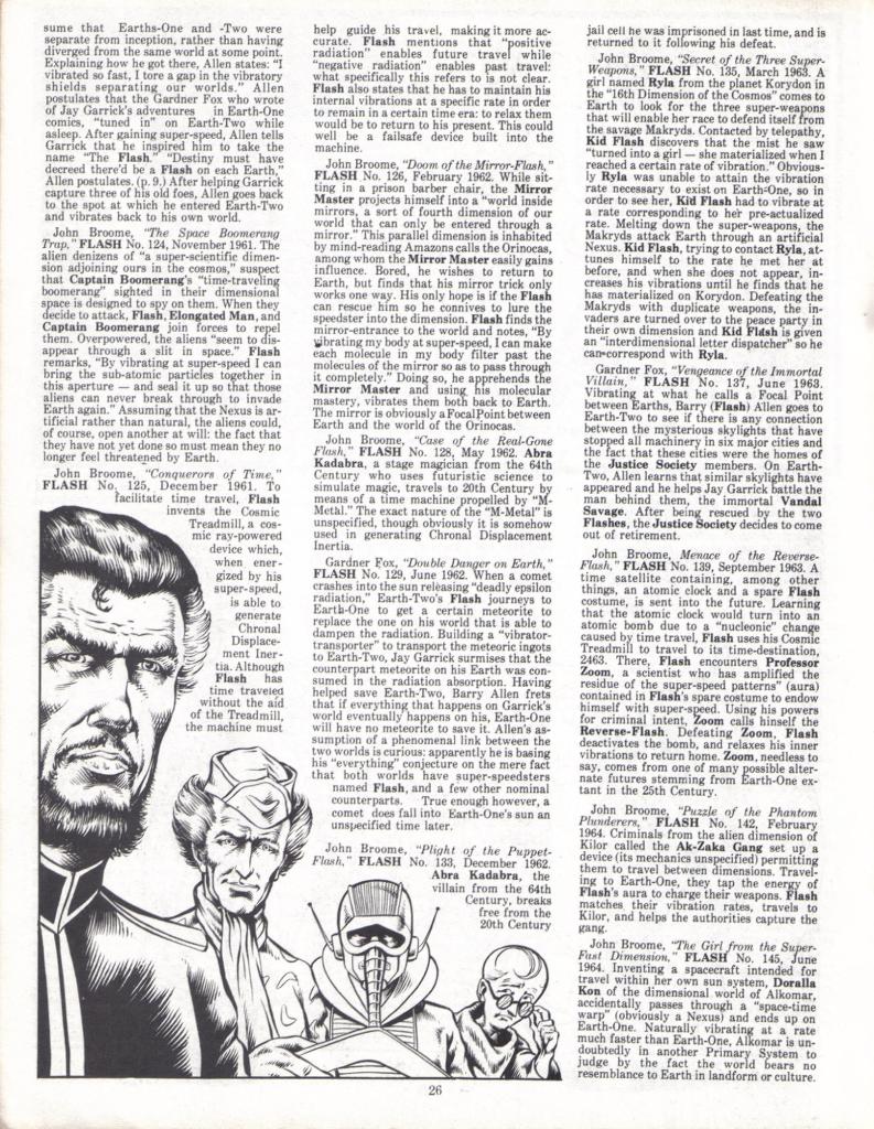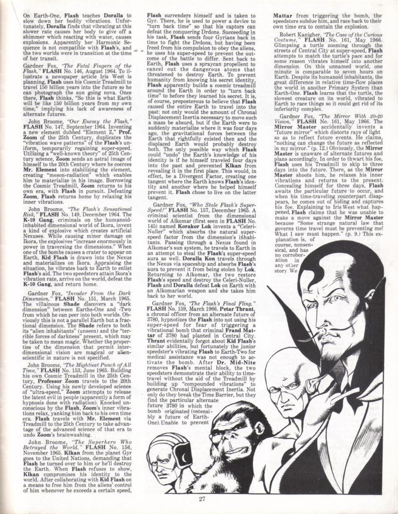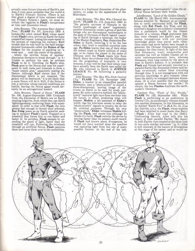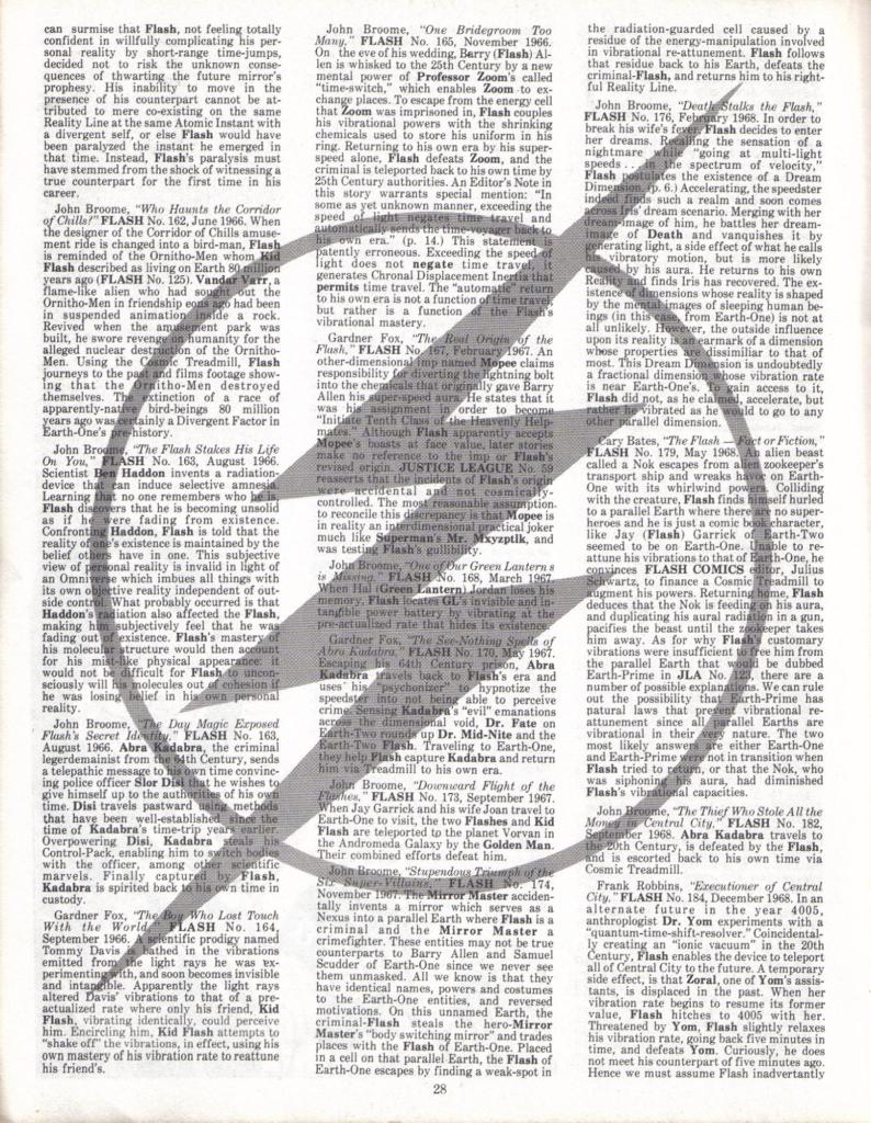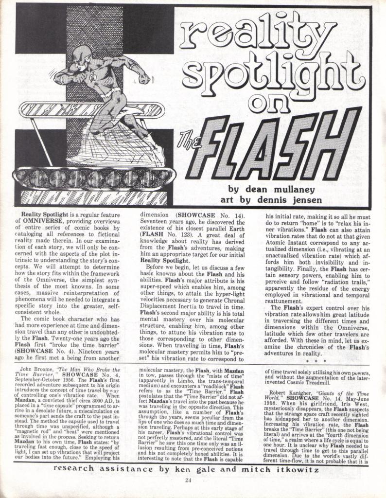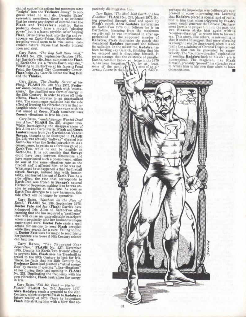 Next up is an overview of an entire comic book series, in this case THE FLASH as written and researched by Dean Mullaney with the help of Ken Gale and Mitch Itkowitz. Dennis Jensen, who in later years will ink Carmine Infantino on the title, provides a header and spot illustrations of the Scarlet Speedster.