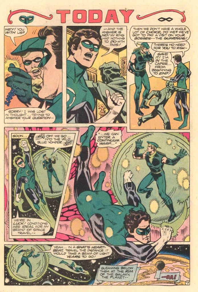 The thing is, Green Lantern’s power ring doesn’t function on magic. It’s the product of super-science so advanced and unfathomable to human beings that it simply appears to be magic to our eyes. Ollie bids the Lantern to think deeply about how this could have occurred, which opens the story up for a two-page recounting of Hal’s origin–how alien Green Lantern Abin Sur’s spaceship crash-landed on Earth and he was duty-bound to pass his ring and lantern on to a worthy successor. That replacement was test pilot Hal Jordan, who was ushered into a larger universe at that moment and became one of the agents of the Guardians of the Universe, a bulwark against evil and injustice in the cosmos. Segueing back to the present, Hal’s reminiscences suggest that if his ring is malfunctioning in some strange way that he ought to check in with his bosses the Guardians who may be able to diagnose the problem and correct it. So Lantern and Arrow head off for the far-distant planet Oa, headquarters of the Green Lantern Corps.