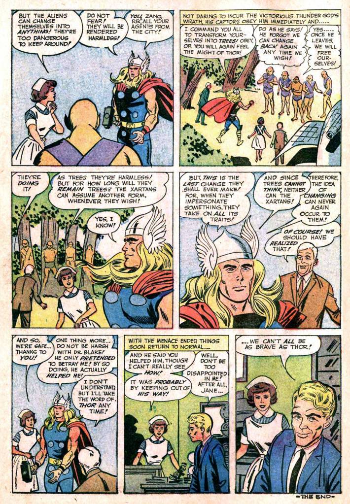 The story’s plot is another variation on a situation that Lee’s line of comics had been doing wrinkles on for years, beginning before super heroes made a comeback. It’s about an alien race, the Xartan, colloquially known as the Carbon Copy Men, who attempt to conquer the Earth by using their power to change their forms so as to resemble anyone to replace human beings in key positions. They’re sort of a cut-rate version of the Skrulls from FANTASTIC FOUR #2. Thor gets involved after the people around him, including Jane Foster, begin acting weird, but he’s separated from his hammer for too long and reverts to his vulnerable Don Blake identity and is captured before he can rout the invaders.