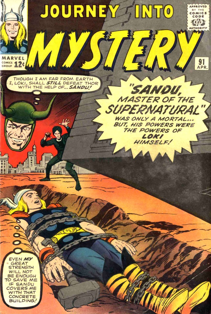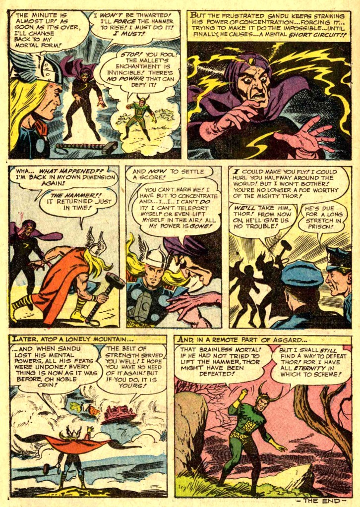 At the story’s end, Sandu short-circuits his newly-gained mental powers when he attempts to use them to lift Thor’s hammer–bad move. So the villain is caught and brought to justice, ad far away in Asgard, Loki steams and plots anew. It’s another relatively brainless story, very much of a piece with what DC or Archie or Dell were publishing in their hero books. Without Kirby, there really isn’t any spark of anything interesting.