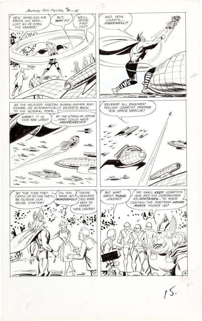 And lastly, let’s look at JOURNEY INTO MYSTERY #91. For this issue, I don’t have any scans of any of the original art pages, so we’re going to need to rely solely on the printed book for insight. It’s a bit more caption-heavy than #90 was, more in line with the work in #89, where the captions drive elements of the plot. And the splash page by Joe Sinnott, as you can see above, is the inverse of the previous two, beginning with three smaller panels before going to a large title shot. It also seems as though penciler Sinnott didn’t leave a whole lot of space for the story intro and title, it’s a bit crammed in there as opposed to previously.