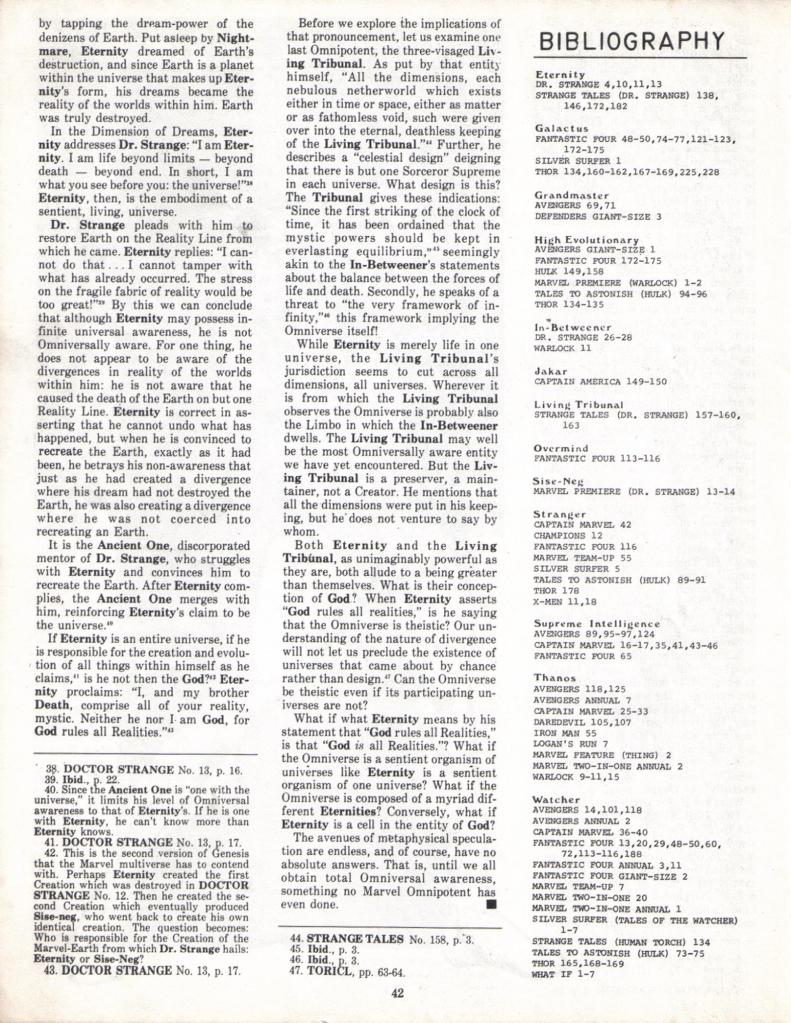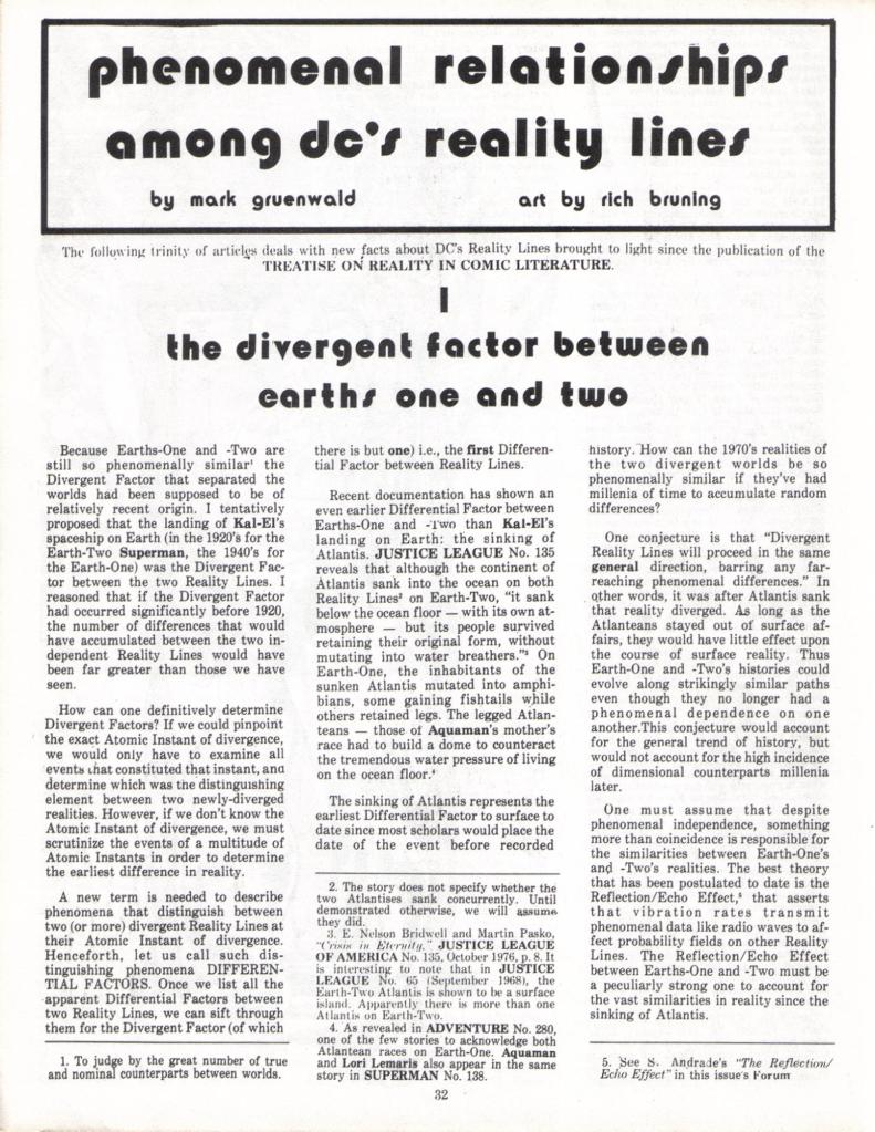 This is the third and final part of our survey of the first issue of future Marvel Executive Editor Mark Gruenwald’s classic fanzine OMNIVERSE, which dealt with the question of consistent reality in comic book stories. Or continuity, as it is more typically thought of. While it didn’t quite reach the heights of a scientific journal, the people working on OMNIVERSE clearly took their task seriously and produced prose that attempted to be scholarly.