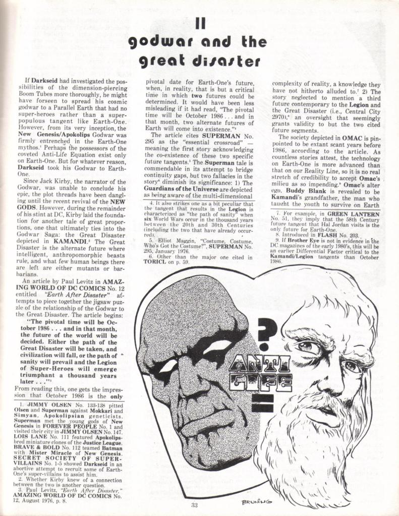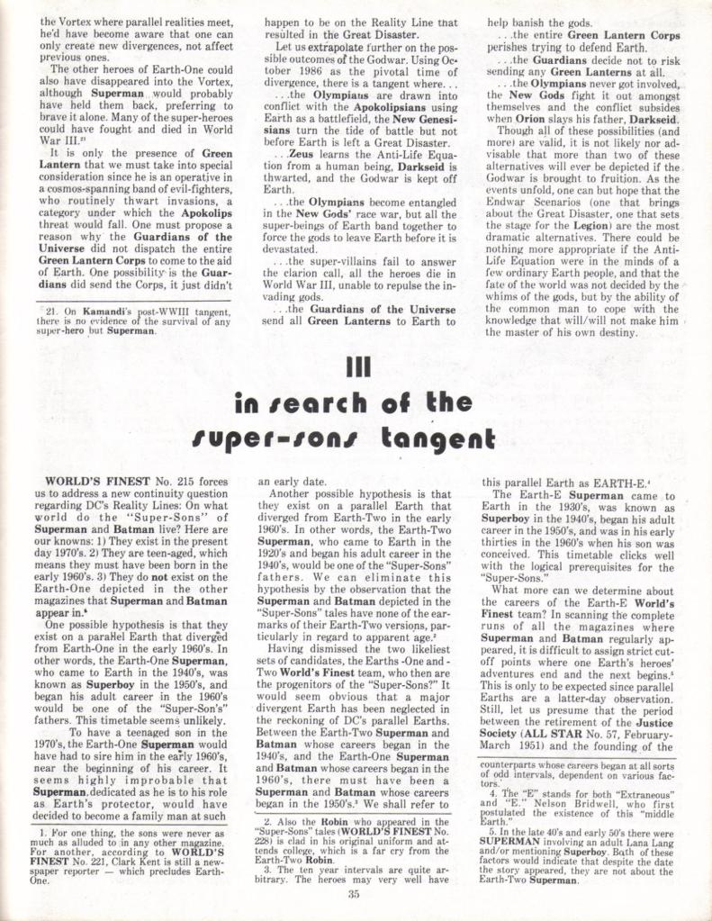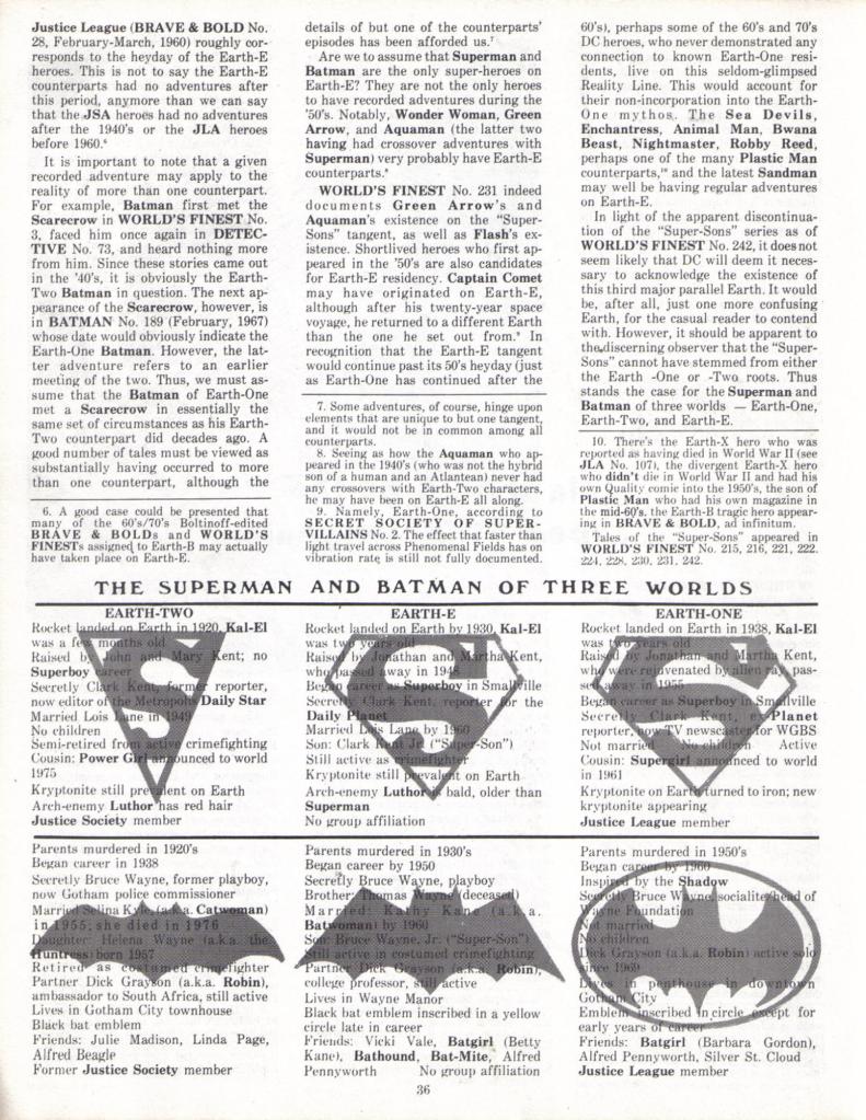 The cover feature was this article written by Mark himself and illustrated by Rich Bruning in which Gru postulates the existence of an Earth E, which exists between what we know of as Earth-1 and Earth-2 and which contains all of the adventures of Superman and Batman that don’t quite fit onto teh other two worlds, mostly those that occurred during the no-man’s-land between the end of the Golden Age and the start of the Silver Age. It’s an interesting idea, but very fannish.