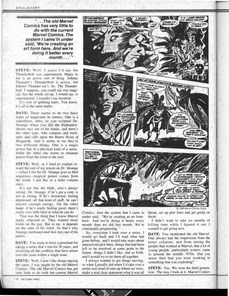 As the Direct Market opened up in the late 1970s and early 1980s, in addition to a sudden surge in prospective comic book publishers there also came an increased number of comic book fanzines. These publications tended to have better production values as a whole than the cheap mimeographed publications of years past, but most of them didn’t last for very long. Quality ran the gamut, often in the same release, with amateurish work sitting next to features of greater value. In particular, there are a wealth of lost or forgotten interviews with mainstay creators in the field that appeared in these largely-forgotten publications. So here, we’re going to look at an interview that writer Steve Englehart gave to The Comic Times in 1980, as conducted by David Singer, who himself would go on to notoriety as the person who launched a revival of the T.H.U.N.D.E.R. Agents believing the property to be in the public domain. I talked about this in somewhat greater length here: