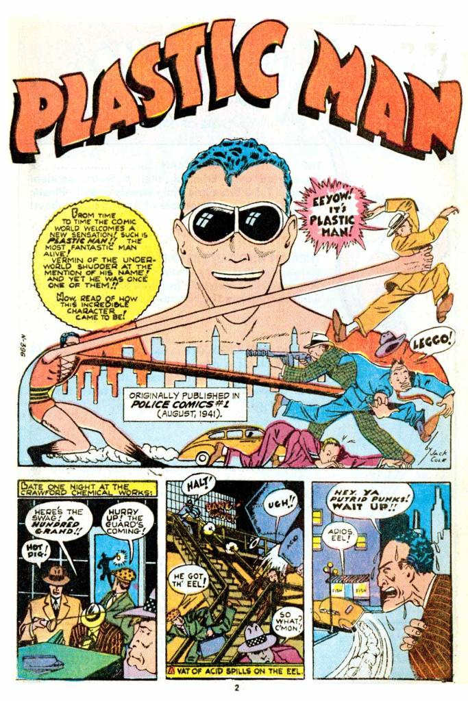 Plastic Man hadn’t started out as a DC character at all. Rather, he was something of a surprise hit for Quality Comics in the early 1940s. He started out as a 6-page back-up feature but generated enough interest that he soon earned the front spot in his anthology home, POLICE COMICS. Plastic Man’s self-titled series ran until 1956, longer than most other super hero series of the era (though the final batch of issues were all reprints.) When Quality Comics got out of the comic book business, they sold their assorted titles and properties to DC/National Comics. This included BLACKHAWK, G.I. COMBAT, and the defunct Plastic Man. DC didn’t do anything with the character for years, until an advertiser made unauthorized use of the hero in a print ad shilling for undergarments, the ad agency apparently mistakenly thinking that he’d fallen into the public domain. DC rushed an appearance of the hero into the most readily available title: the Dial “H” For Hero strip in HOUSE OF MYSTERY. And they also chose to take advantage of whatever public spotlight was now on Plastic Man to attempt a new series with the pliable policeman.