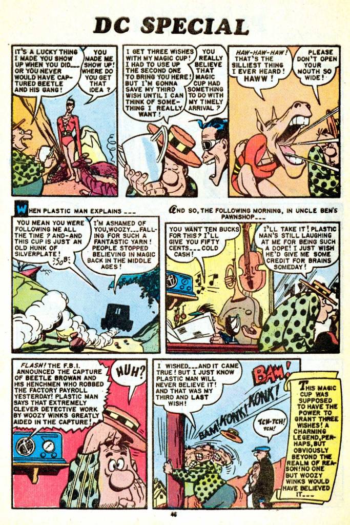 The 1960s revival, though, contained little of the appeal of the original strip. Its humor was labored, it couldn’t quite decide how comedic and how dramatic it wanted to be, and it jettisoned everything apart from Plastic Man himself, surrounding him with a new cast and a new status quo. Eventually in the series, it was revealed that the guy we were reading about wasn’t the original Plas at all, but his son. Papa Plas and Woozy Winks come out of retirement for one last caper. But the book wasn’t successful and the series was cancelled, another casualty of the bubble bursting on the super hero book of the era. Why DC decided to devote this issue of DC SPECIAL to Plastic Man is a bit of a mystery to me–there’d be a revival of the strip a few years later, possibly prompted by good sales of this issue. And there was a constant low level of interest in an animated series, which eventually turned up later in the 1970s as well. But regardless, this issue was chock-full of stories by Plastic Man’s originator, Jack Cole. And they’re all really good.