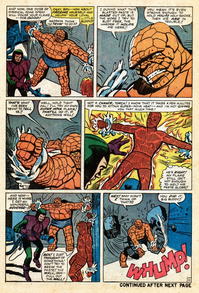 But this is an action-adventure story, and it wouldn’t be much fun if the Thing simply reduced Pete to a grease stain on Page Six. So instead, Pete does wind up getting the upper hand on the FF’s powerhouse, eventually pasting him into immobility on a wall in his headquarters. He’s then able to send a signal to the Torch, whom he’s able to incapacitate as well with his “asbestos paste”. Asbestos was treated as a kind of miracle fireproof substance in these days, the Torch’s equivalent to Kryptonite. And so both heroes are now stuck to the wall, with Pete preparing to finish them off. There are probably a dozen ways the FF members can liberate themselves and put Pete on the ropes here, but the Thing goes for the simplest one: destroying the wall he’s attached to rather than the paste that’s holding him. And now, because we’re getting short on pages, the tables have turned.