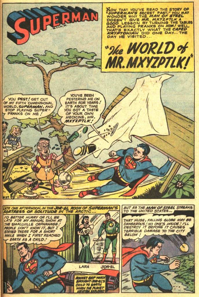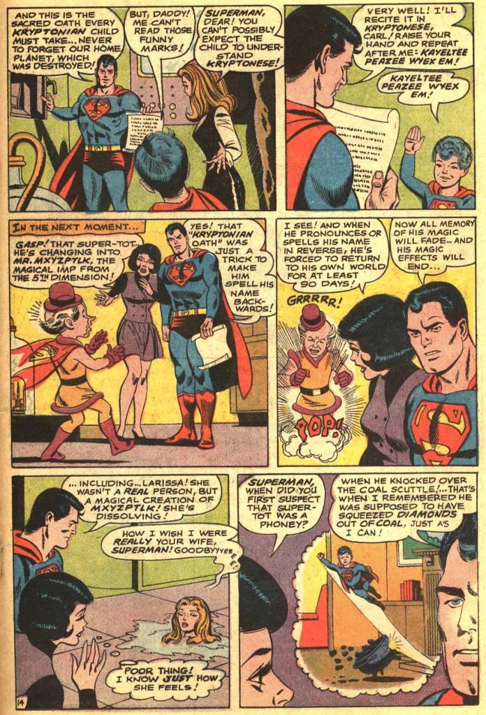 Convinced of the authenticity of his lost wife and Son, Superman spends several pages cleaning up after his boy, who goes on a playful rampage across the countryside. Eventually, he takes Larissa, Carl and Lois to his Fortress, intending to perform a solemn Kryptonian ceremony in the presence of the Bottle City of Kandor that will make his union with Larissa official. But Superman has figured out what is going on, and amidst the Kryptonian Oath he asks Carl to recite is Mr. Mxyzptlk’s name spelled backwards. Carl is Mxyzptlk, and Larissa a product of his fifth dimensional magic. Turns out that Kryptonite that Superman exposed Carl to was fake–see, he wasn’t such a jerk after all! And that proved that carl wasn’t what he appeared to be. Now with Mxyzptlk sent back home, the effects of his magic wear off and Larissa melts away into nothingness. And that’s the story. No threat, no jeopardy, nobody to save that wasn’t imperiled by his actions in the first place, and Superman being swooned over by people who constantly tell us that he’s the world’s greatest hero while not showing him doing anything that might earn him that title. The disconnect in this book is profound, and it bugged me even though I couldn’t then have put my finger on what was wrong.