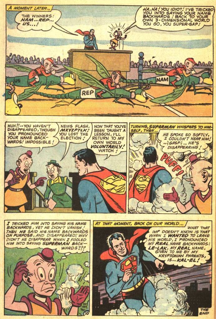That said, this older yarn is the most entertaining thing in the issue. It was written by the Man of Steel’s creator, Jerry Siegel, and illustrated by Al Plastino. In it, after a particularly vexing encounter with Mr. Mxyzptlk, Superman decides to follow him back to the fifth dimension and give him a taste of his own medicine. So he pranks Mxy mercilessly, ruining the imp’s attempts to be elected mayor. Mxyzptlk tries and fails repeatedly to get Superman to say his name backwards, thus returning him to the third dimension, but Superman is simply too clever for him. Finally, though, he succeeds–and is horrified to realize that Superman hasn’t gone anywhere, he’s still in the fifth dimension unaffected! By this point, Superman reckons that Mxy has had enough, and he whispers something unheard by the imp and vanishes. Because obviously Superman is not the guy’s real name–rather it is Kal-El. So the word Superman had to utter in order to return home was Le-Lak.