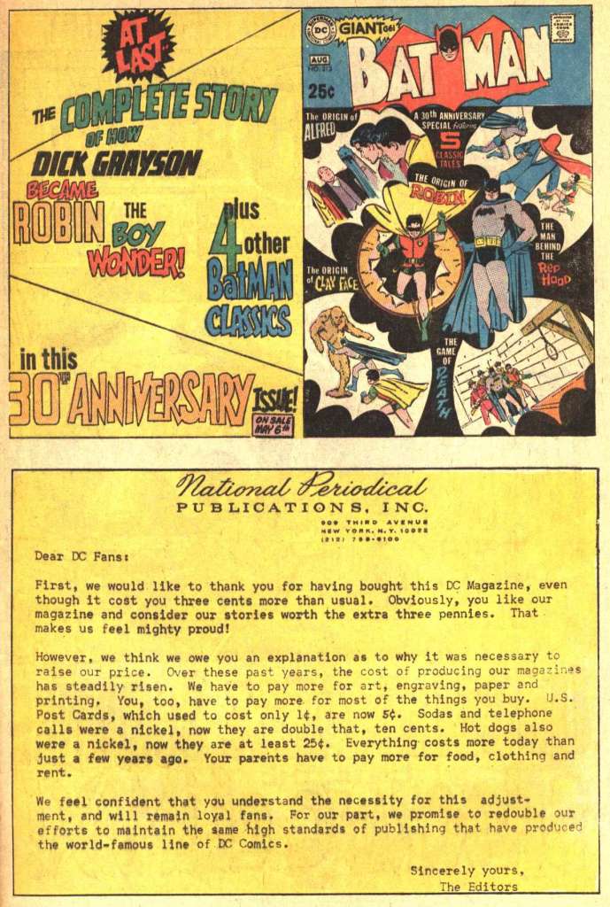 The issue closes with this page, with is noteworthy both for the half-page House Ad promoting the latest BATMAN Giant which focuses on the life and career of Robin, as well as a half-page editorial column explaining the cover price increase. It’s a real study in contrasts as opposed to how Stan Lee handled situations like this. It comes across as dry and lifeless and corporate. It’s perfectly fine, but it doesn’t really do anything to assuage the audience or get them to feel as though they can live without those extra three cents.