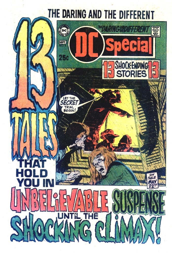 And there’s one more House Ad following that, one that relies even more heavily than usual on text and typography to make its sales pitch. It works, and looks way more modern than anything in the preceding 31 pages, Of course, this would be another book where the packaging concealed disappointment between the covers, as it’s knockout Neal Adams cover was wrapped around a bunch of relatively sedate reprints from the 1950s. More than anything at this moment, the lesson that DC needed to learn was that content mattered. It wasn’t just a compelling cover or a shocking concept that got people buying and returning to buy more comics, it was a satisfaction with what they read when they did so. this was an area in which Marvel was kicking the hell out of the competition at this time, even if ever single Marvel book wasn’t always a winner either.