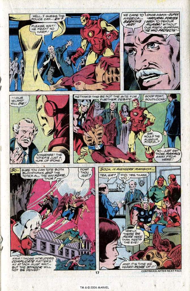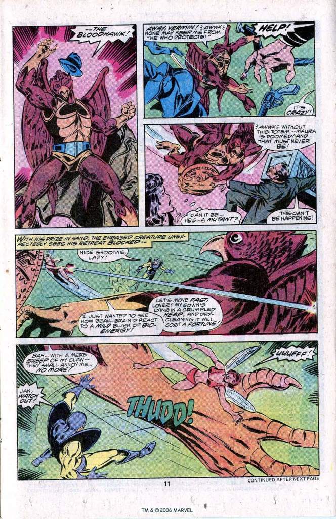 The story opens with the Black Panther cleaning up on a gang of crooks who are in the process of pulling a truck heist. The Panther shows off his skills before he’s confronted by a newcomer in a white costume. This figure introduces himself as the Stinger, the man who intends to destroy the Avengers. T’Challa dodges the Stinger’s first attack but falls afoul to his paralytic sting. With one Avenger captured, the Stinger indicates that he intends to strike at the others at a museum benefit they’ll be attending that night. that evening, teh stinge sets up an ambush for the Avengers outside the museum, waiting for them to be departing and off-guard before he begins his assault. But his plans are impacted by what occurs inside the building. At a certain point, a trenchcoat-wearing man loudly enters the main hallway claiming that one of the key exhibits was stolen from his land and his people. Doffing his overcoat, he is revealed as a half-man, half-bird hybrid that calls himself The Bloodhawk.