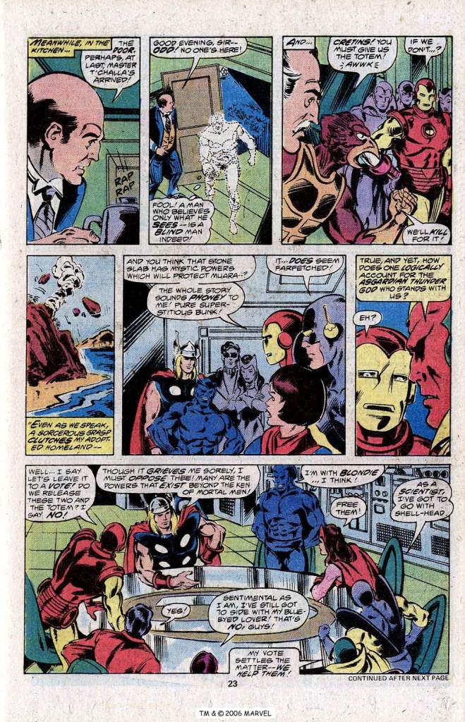 Meanwhile, arriving in Maura, the Avengers fly to the location of the sacred temple said to contain the evil spirits that are plaguing the land. They intend to replace the missing artifact at its crest, thus closing the portal. But before they can do this, they are stunned to see the entire temple rise up out of the Earth. It isn’t just a temple at all, it’s the head of a huge monstrous stone creature. And this is teh menace this second group of Avengers is going to need to contend with next month–because this is where the book is To Be Continued!