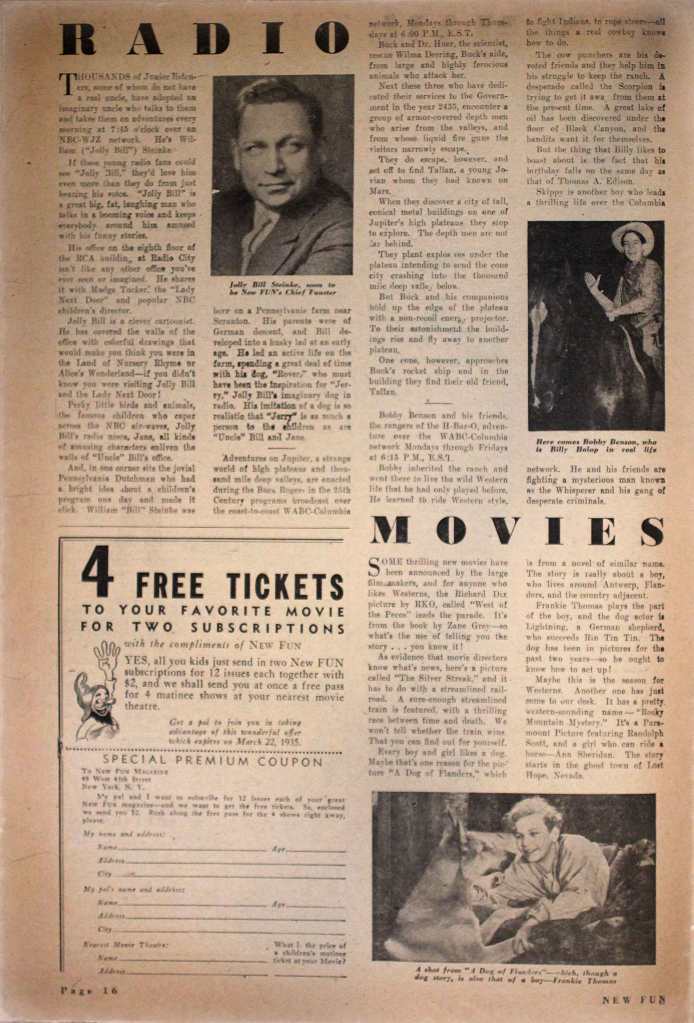 The page was ostensibly put together by “Jolly Bill”, whose role isn’t specifically stated but who comes across as the editor of the magazine. This would be William Steinke, who also did radio voice work. There’s a short profile on him with photo a page earlier in the issue.