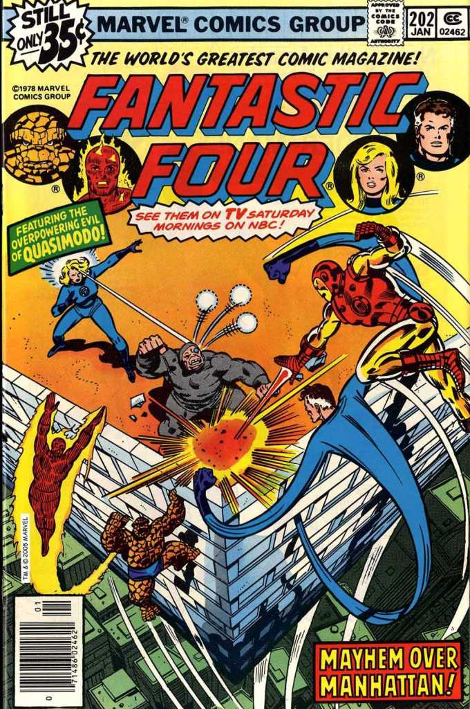 Fortunately, the seemingly-obligatory battle between Iron Man and the Fantastic Four doesn’t happen, as they are ready to believe the Armored Avenger’s story that he was with Tony Stark all day. Nonetheless, Shell-Head chooses to accompany the team as they seek out their stolen building. Using a Proton Tracer to lock on to certain equipment in his lab, Reed is able to follow the trail to a remote island. Throwing caution to the wind, the Thing barrels ahead and right through the outer walls of the Baxter Building, heedless of the warning that the perpetrator will be able to turn all of their security devices against them. That doesn’t happen, though, and the quintet is able to reach the location where the thief is situated. It’s Quasimodo, the Quasi-Motivational Destruct Organ created by the Mad Thinker and given life by the Silver Surfer. And before the inevitable fight breaks out, Quasi is happy to explain to the FF just why he’s stolen their headquarters.