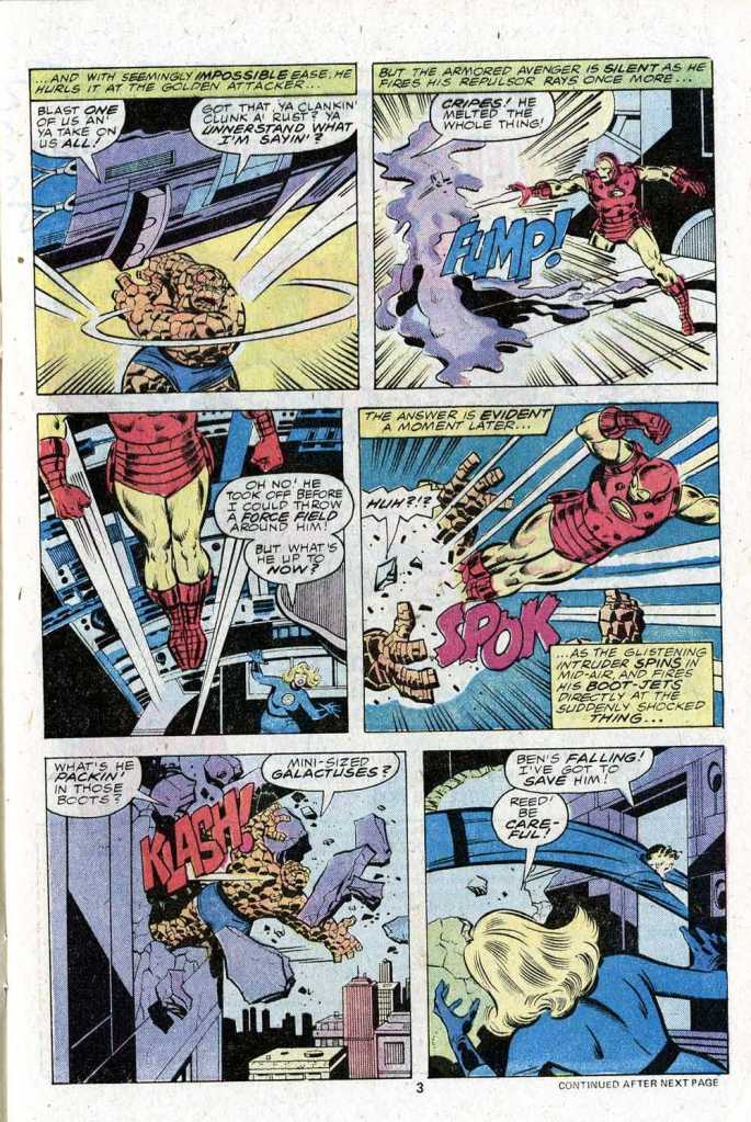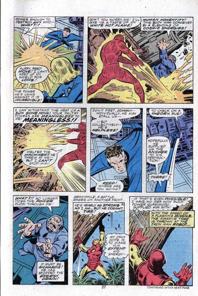 Having been physically paralyzed at the end of a recent bout with Spider-Man and Hawkeye, Quasimodo’s mind was unaffected, and it searched the skies above. There, it detected a far-off world that seemed like a perfect place for him–Marv never comes out and says this directly, but the inference is that this is Xandar, the homeworld of the Nova Corps that the FF will shortly be visiting themselves. Quasimodo wants to reach that world, and he’s detected a starship in orbit around the planet with the same energy signature to it–this would be Nova’s spaceship, which would be taking off for Xandar in another issue of the Human Rocket’s own series. In order to reach it, Quasi needs a rocket like the one the FF have–and in order to get it, he somehow built a duplicate of Iron Man’s armor to function as a servitor. Why Iron Man when he has never encountered the Armored Avenger before is something of a mystery. Anyway, with the plot explained, the two Iron Men hurl themselves at one another while the FF attempt to tackle their old foe.