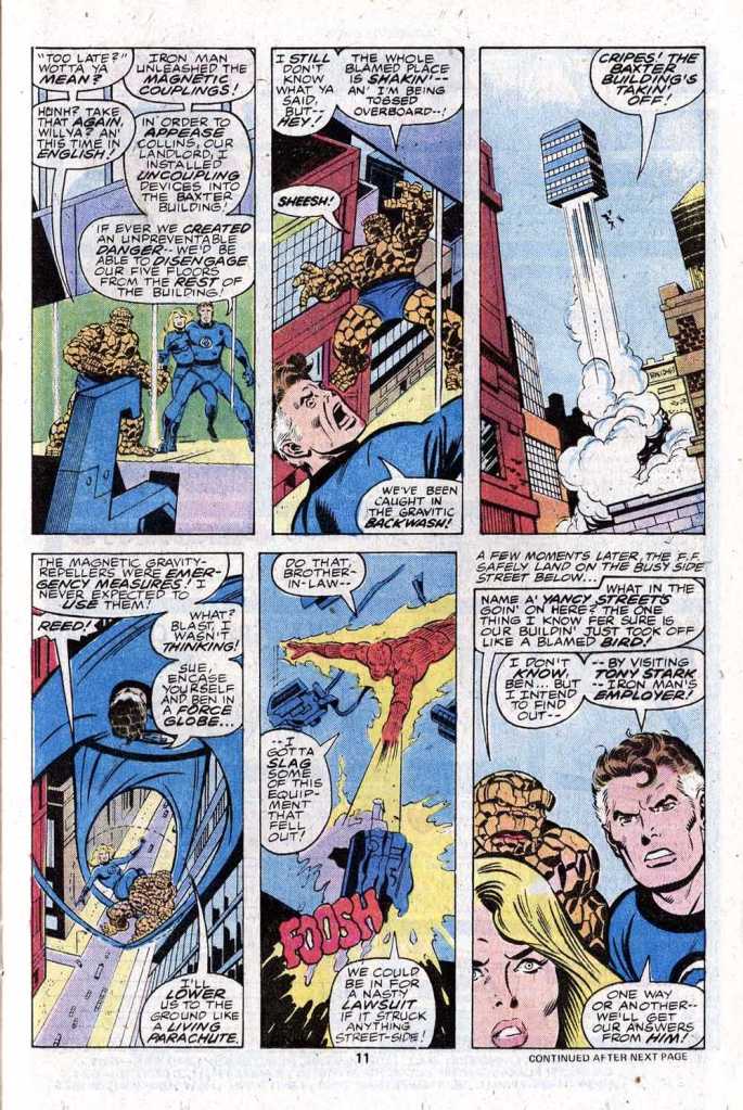 The fight goes on for a number of pages that look like they came right out of John’s textbook HOW TO DRAW COMICS THE MARVEL WAY. Eventually, though, after knocking the Thing out of the structure, Iron Man is able to pull a lever, revealing what is perhaps the silliest aspect of this new version of the Baxter Building: it’s set up so that, in times of crisis, the upper floors that house the Fantastic Four’s home and headquarters can be separated from the rest of the building and shot off into space. As the defeated FF look on, their home goes sailing away from them to parts unknown. But Reed and company know where to begin looking for it: they intend to pay Tony Stark a visit.
