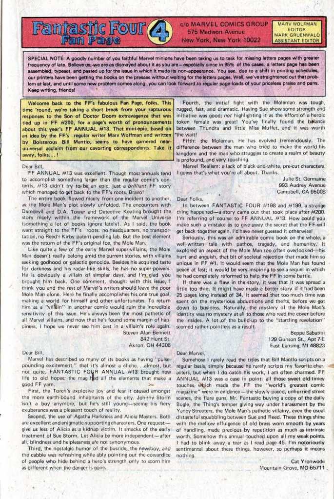 And the Fantastic Four Fan Page this time out includes a letter from Cat Yronwode, soon to be the head editor at independent publisher Eclipse Comics as well as a chronicler of the works of Will Eisner. Seems that she liked the recent FANTASTIC FOUR ANNUAL that we talked about here: