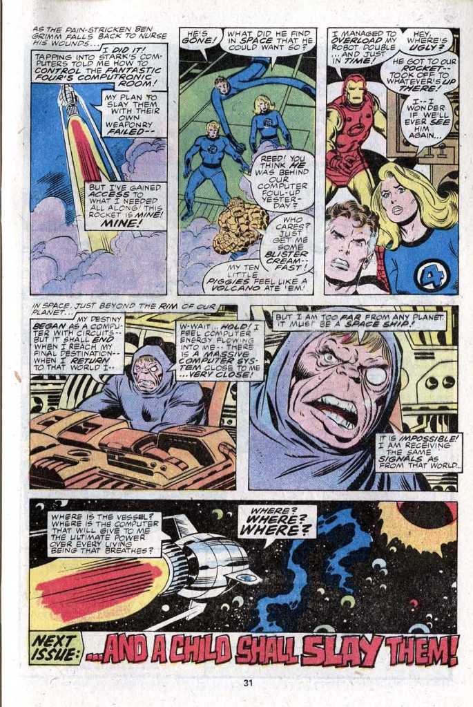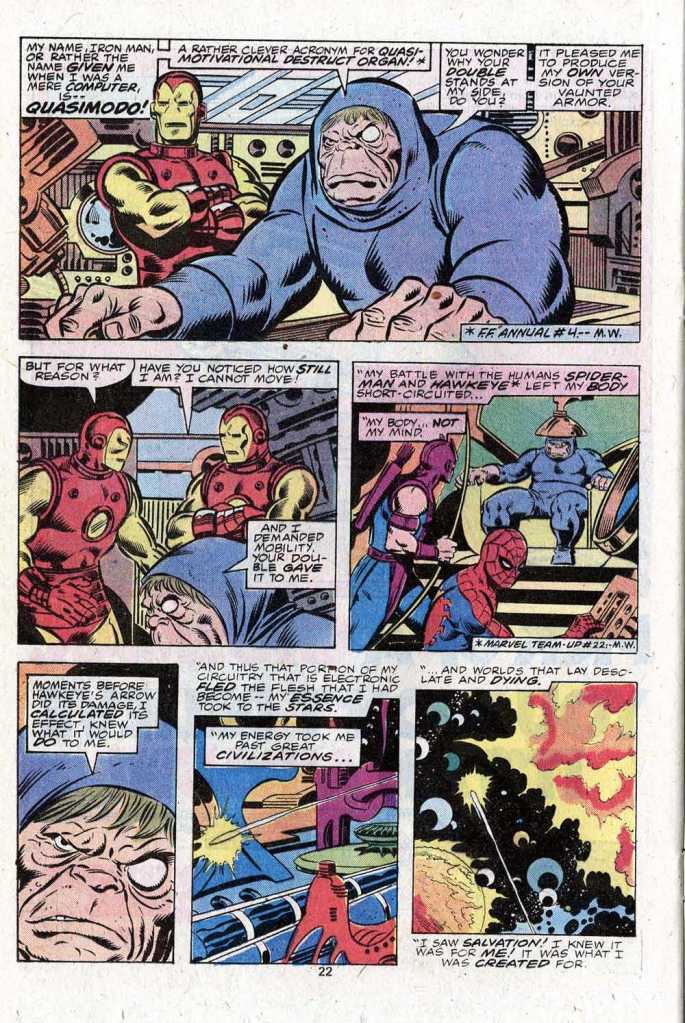 Iron Man is overmatched by his duplicate, who has greater stores of power than he does. So he makes the obvious choice: he feeds his own armor’s power reserves into the bogus Iron Man in the hopes of overloading it–as, indeed, it does. Elsewhere, the FF wage another losing battle against Quasimodo–they were not covering themselves in glory this issue–who is able to escape them and make his way to their rocket launch bay. Despite teh Thing’s best efforts to hold the space ship back by hand, Quasimodo gets away. But as we follow him into space, the signature of the spaceship that he had detected has vanished–an event that tied loosely into what would be to come in NOVA #24. But Marv doesn’t really give the readers any indication of this, and so they whole wrap-up here is a bit inscrutable and unsatisfying. It feels as though this is going to be followed up on somewhere, but it never really is, not Quasimodo’s part in it anyway. Perhaps Marv would have gotten back to him if NOVA had continued on as a series, but it was on the verge of cancellation at this point.