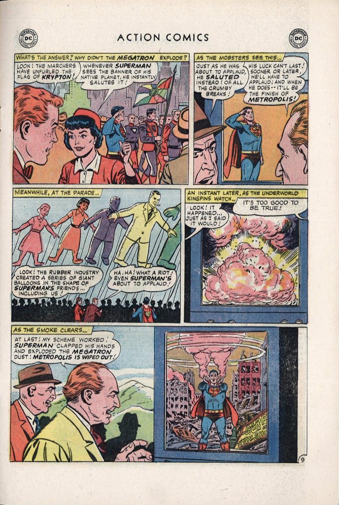 The Gang is able to put Mr. Gimmick’s plan into motion on Superman Day, with two of their members shaking hands with the Man of Steel and using the opportunity to coat his palms with the twin compounds. From this point on, most of the rest of the story is a frustrating waiting game for the criminals, as they watch the proceedings remotely on a tele-viewer,. Every time it looks as though Superman is about to bring his hands together and thus set off the detonation, some quirky thing prevents it from happening. Eventually, though, after more pages than you would guess, Metropolis’ luck runs out and Superman claps–thus destroying the entire city in the manner of the cover image.
