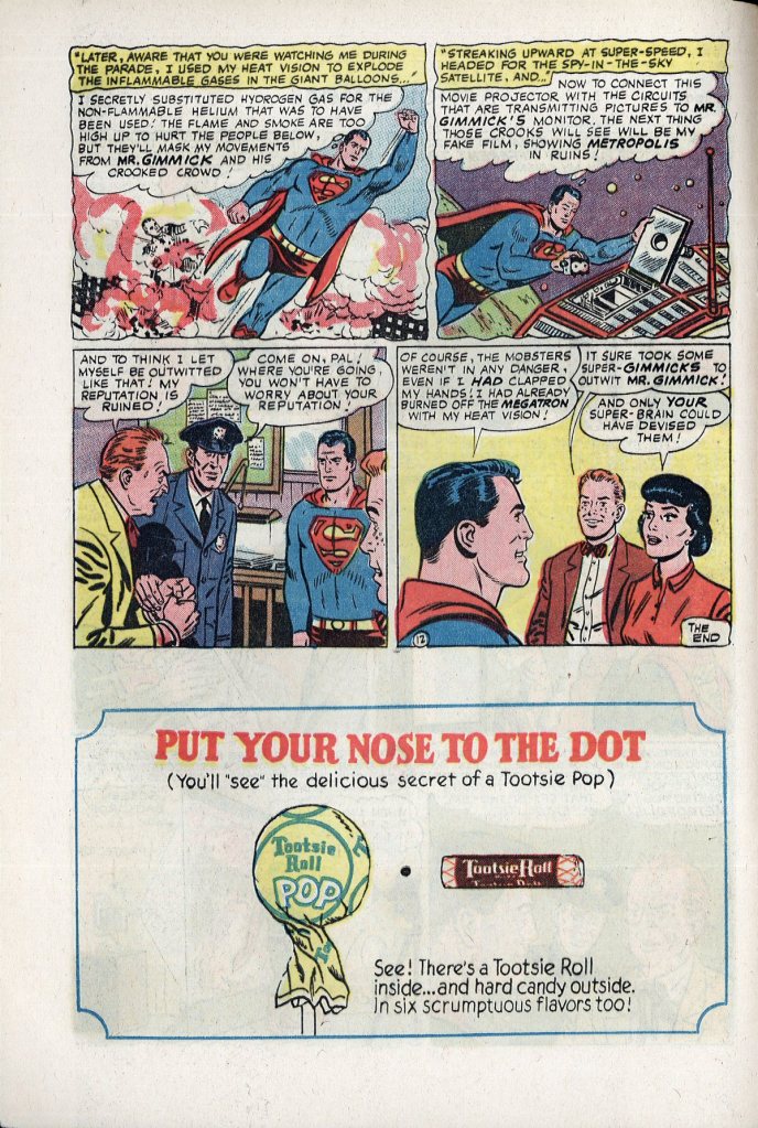 Of course, this turns out to have been a trick, a ploy perpetrated by the Man of Steel to make the Anti-Superman Gang and Mr. Gimmick think their plan had been successful before he stepped in and collared them. He’s been ahead of them the whole time, and was just messing with them by contriving all of those instances when his clap was avoided. And he used special effects to simulate the destruction of Metropolis that the Gang saw televised. So it’s a one-sided victory for the Man of Steel–and one that’s really just about without any action whatsoever to speak of.